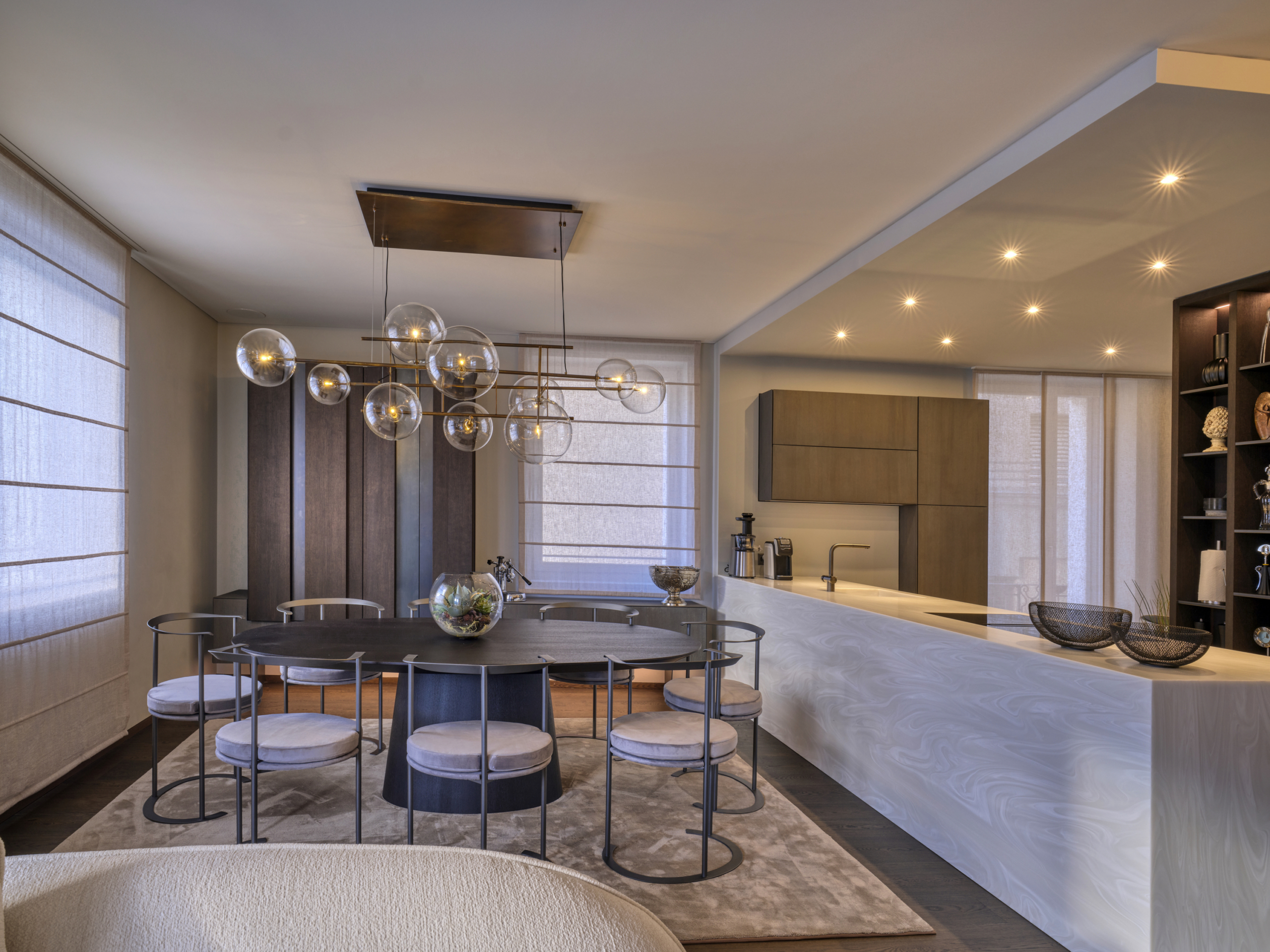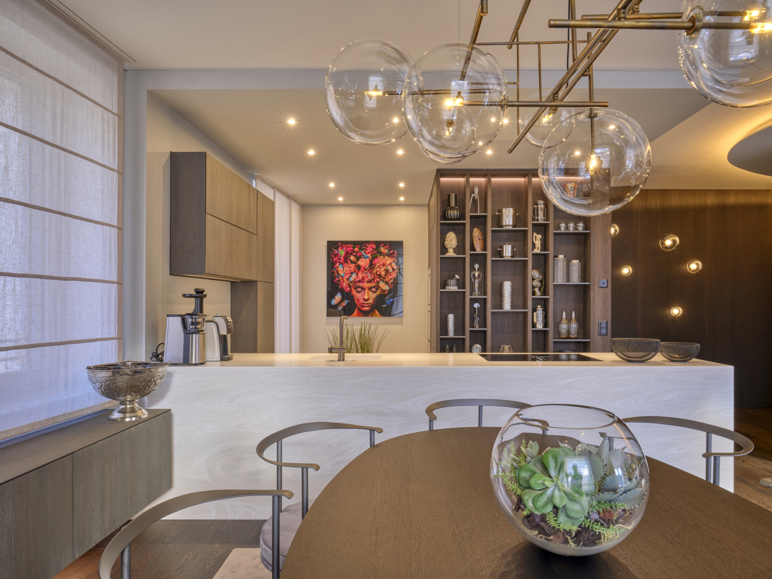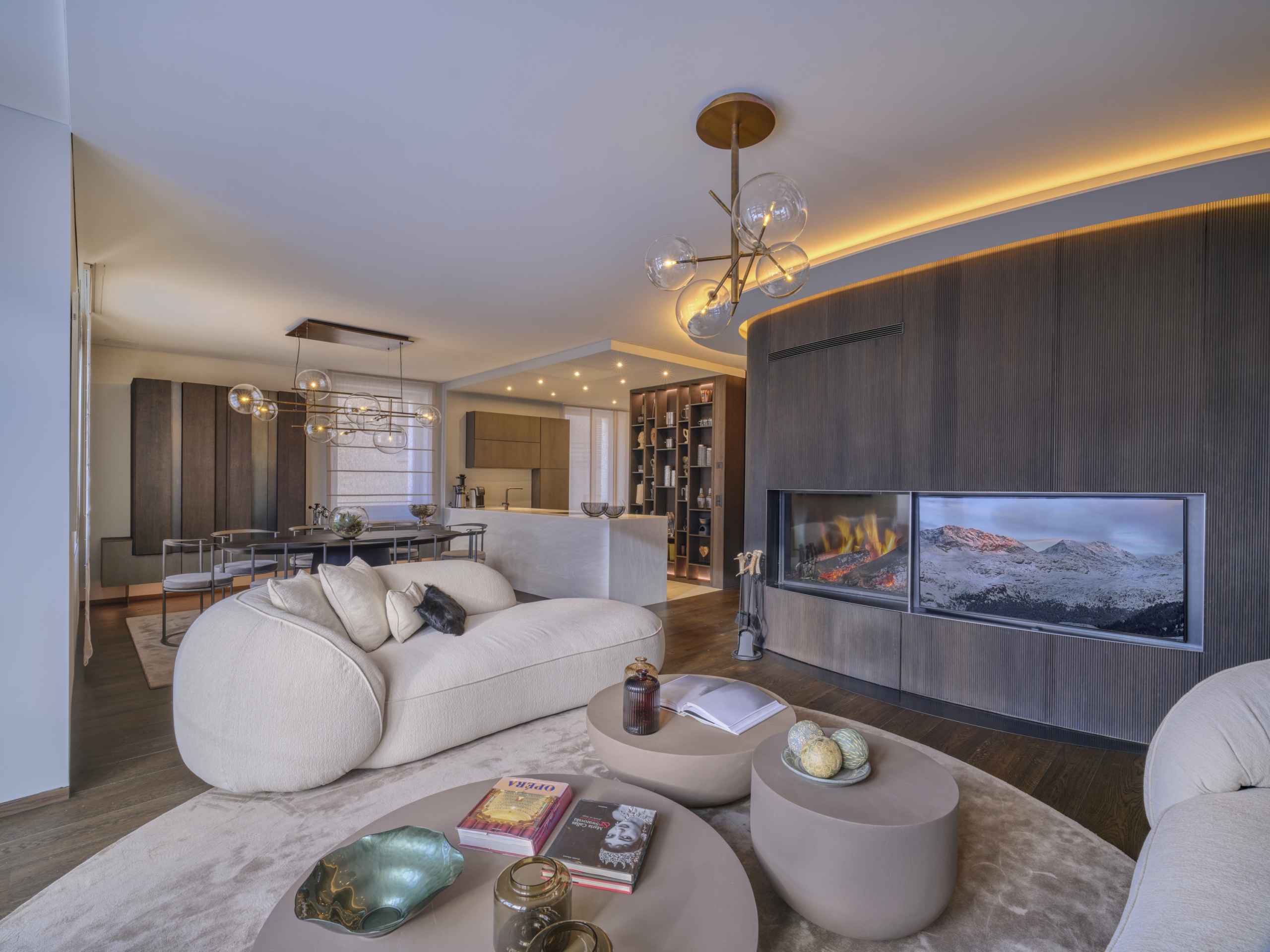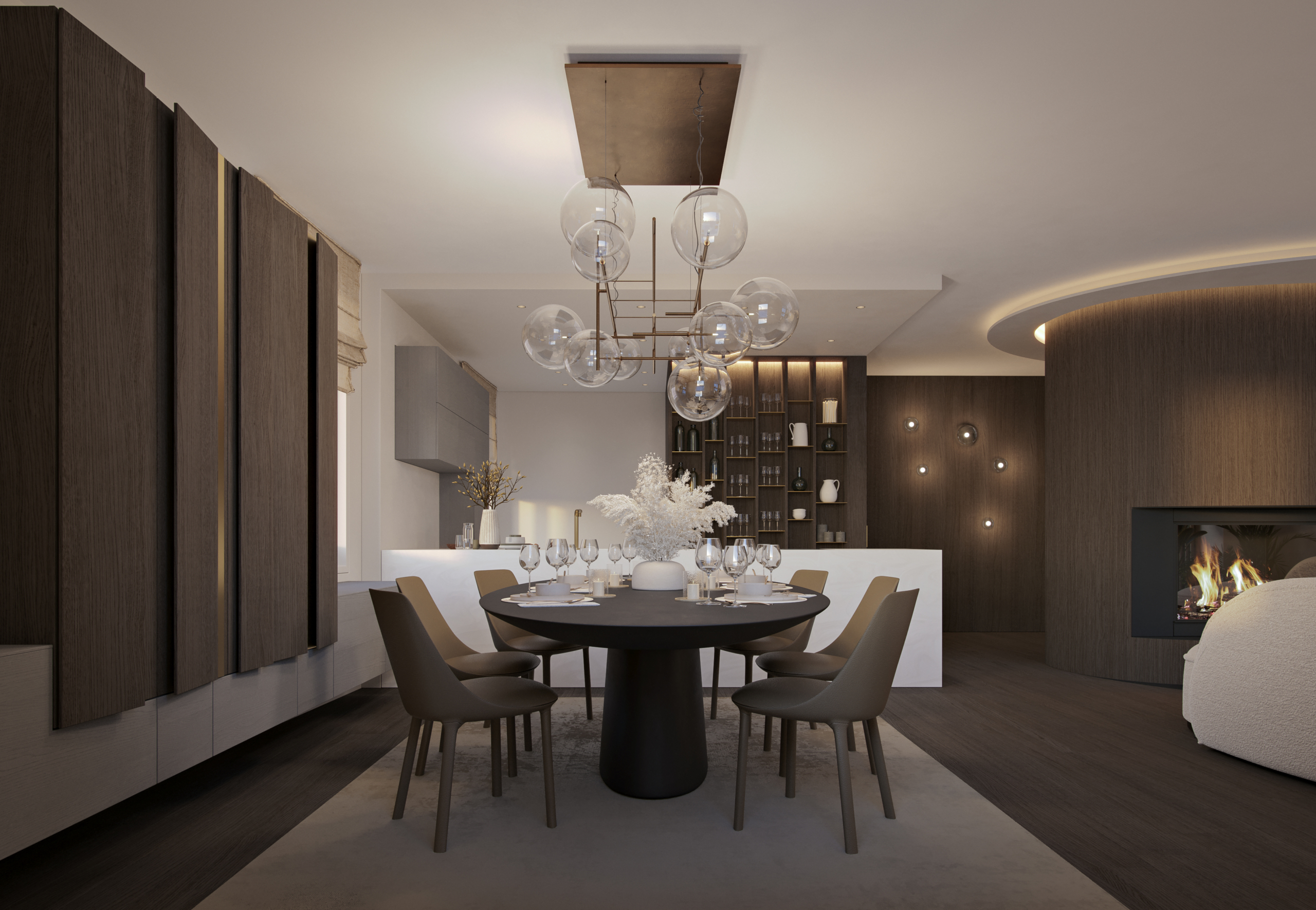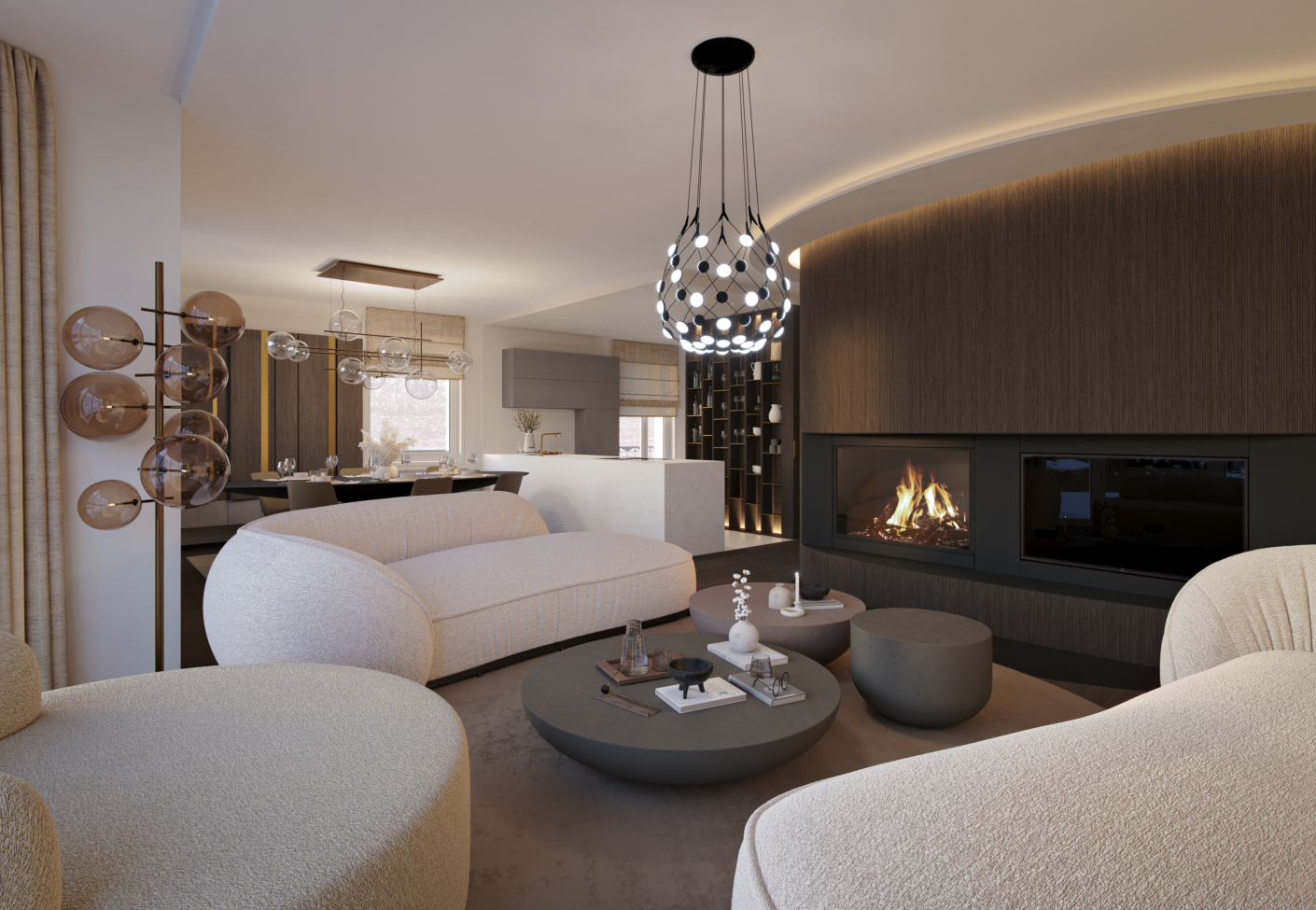 Die Wohnung Chic Retreat ist ein Beispiel für eine Renovierung, die Funktionalität und ästhetische Harmonie vereint. Die hellen, offenen Innenräume sind darauf ausgelegt, das natürliche Licht zu maximieren und hochwertige Materialien hervorzuheben. Küche mit Insel, Essbereich und Wohnzimmer mit Kamin schaffen eine elegante, einladende Atmosphäre, während die Schlafzimmer und privaten Räume Komfort und Ruhe bieten. Detailgenauigkeit und Materialqualität spiegeln das Maximum Wellbeing-Konzept in allen Bereichen wider.
