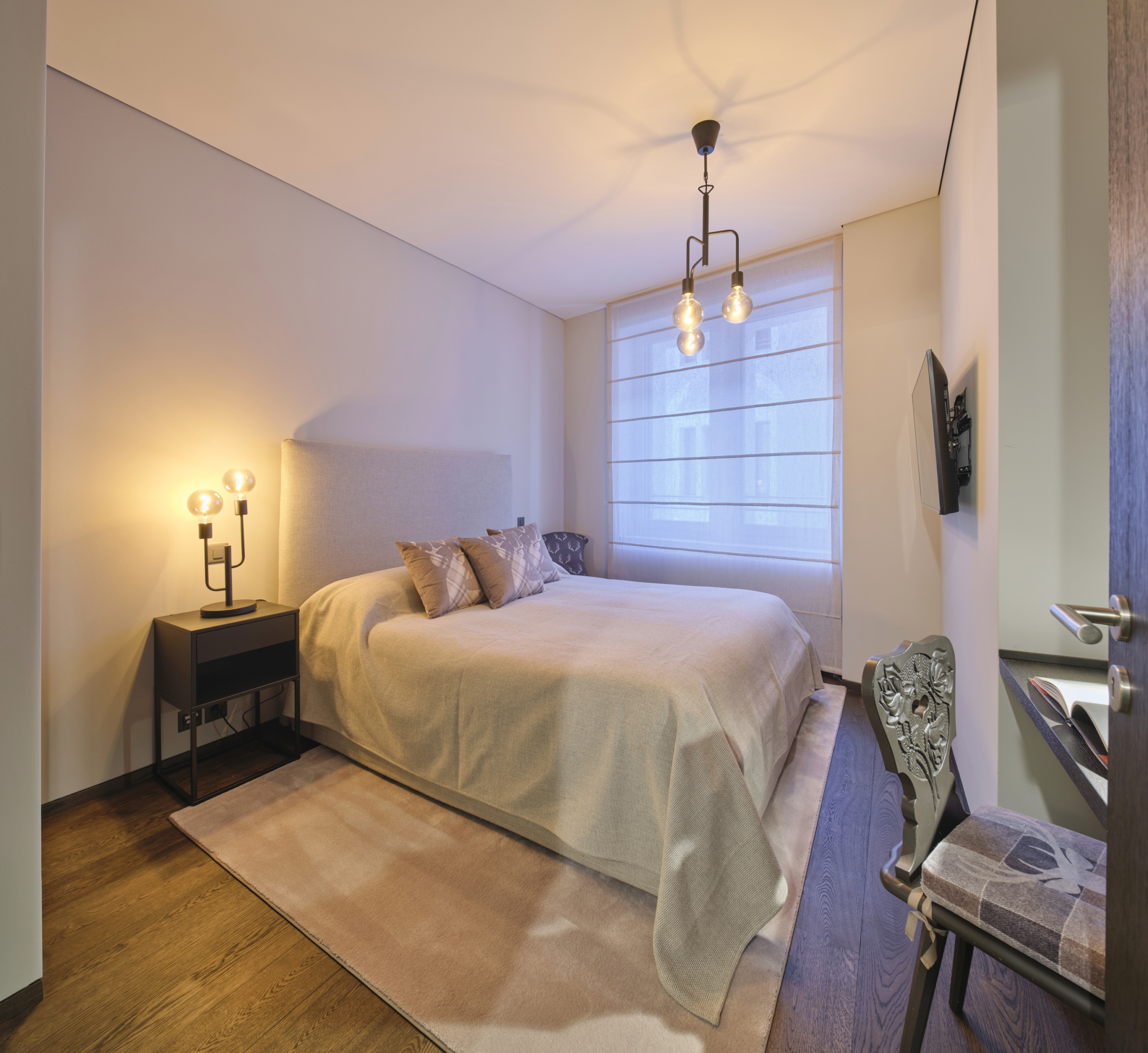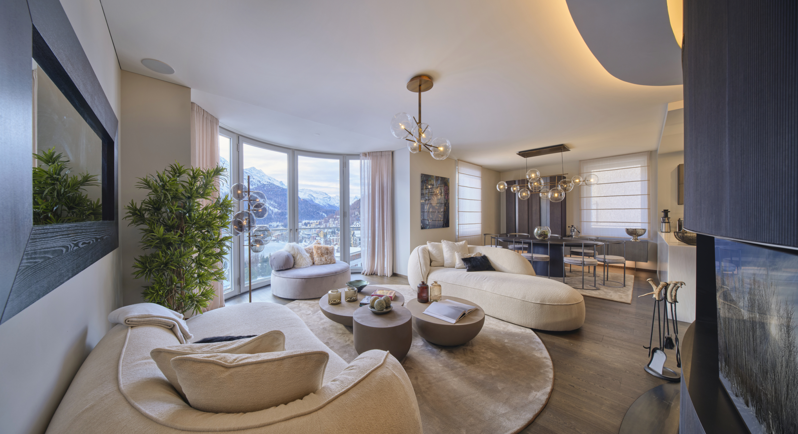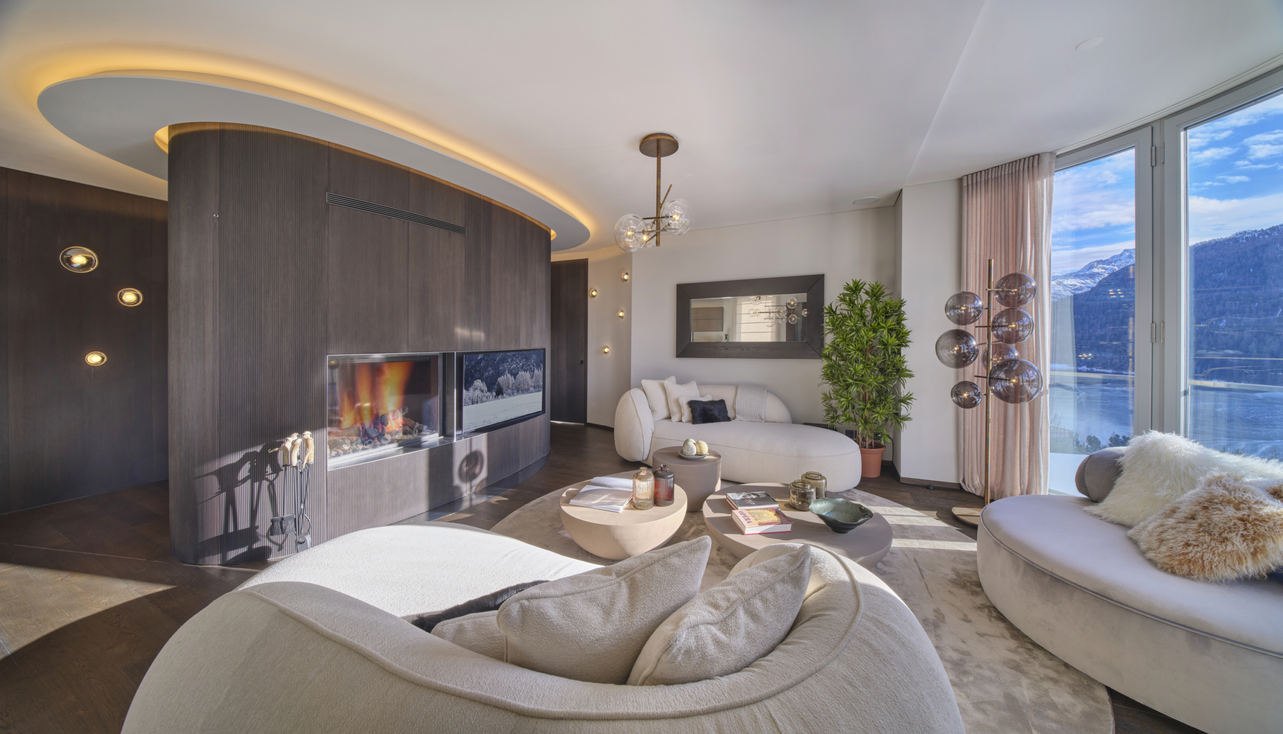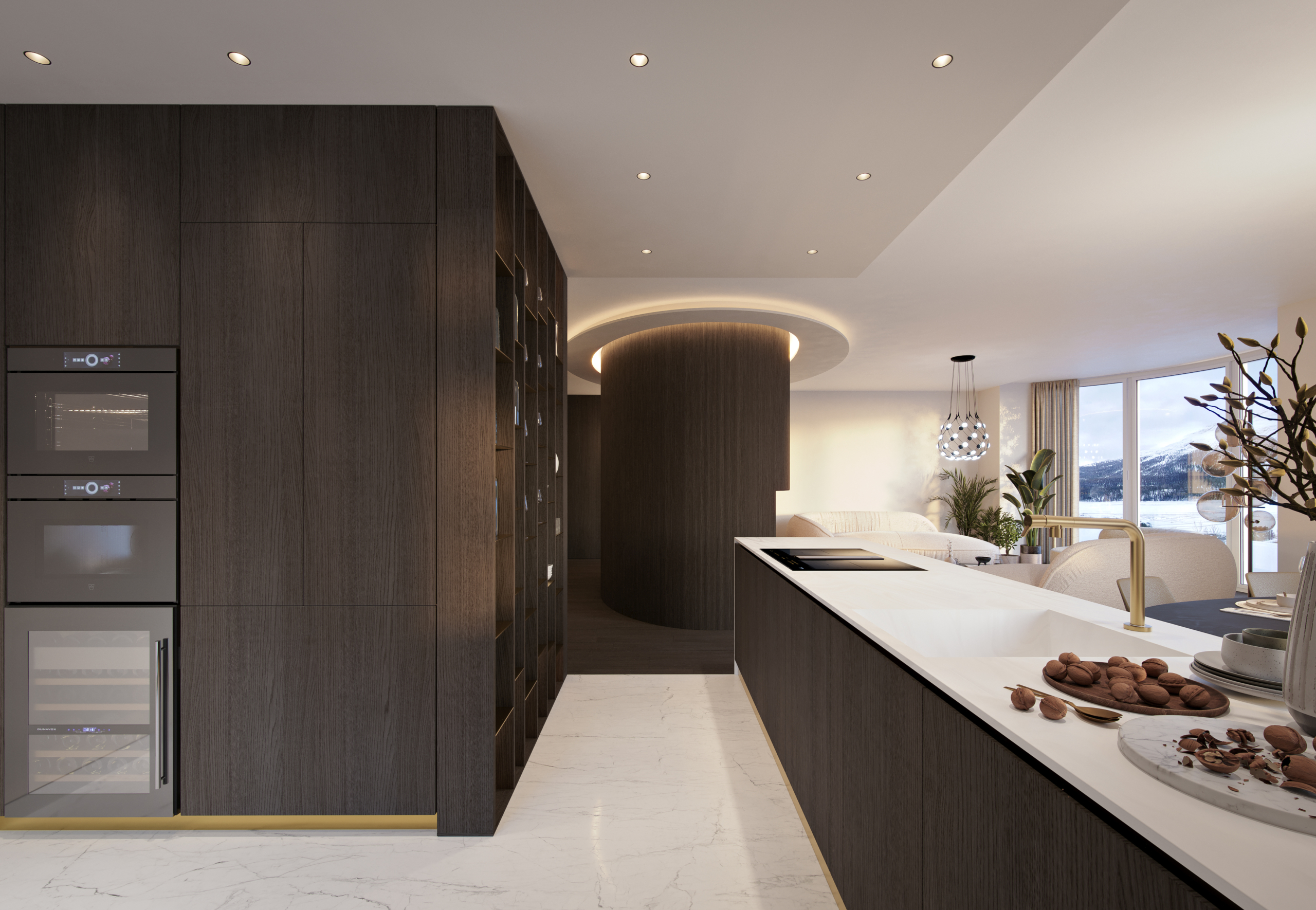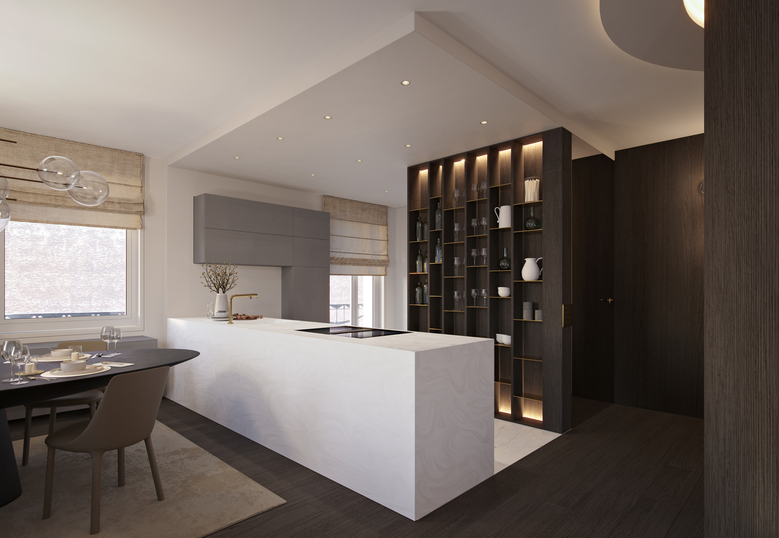 Die Wohnung Chic Retreat ist ein Beispiel für eine Renovierung, die Funktionalität und ästhetische Harmonie vereint. Die hellen, offenen Innenräume sind darauf ausgelegt, das natürliche Licht zu maximieren und hochwertige Materialien hervorzuheben. Küche mit Insel, Essbereich und Wohnzimmer mit Kamin schaffen eine elegante, einladende Atmosphäre, während die Schlafzimmer und privaten Räume Komfort und Ruhe bieten. Detailgenauigkeit und Materialqualität spiegeln das Maximum Wellbeing-Konzept in allen Bereichen wider.