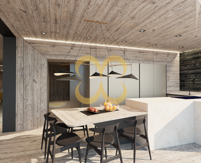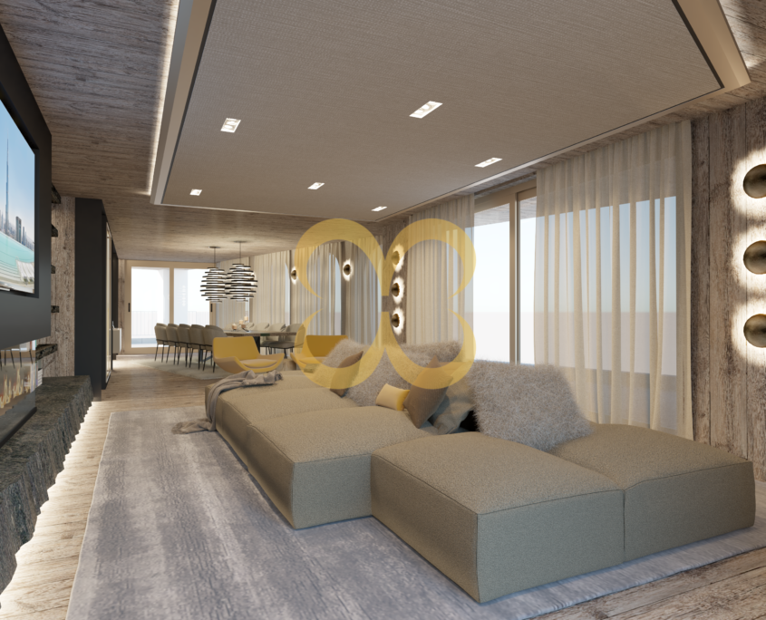 Großes Wohn-Esszimmer mit Kamin und drei Ausgängen zur Terrasse