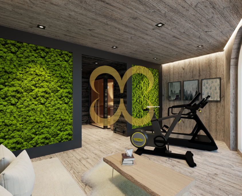Fitnessraum, Sauna und Erlebnisdusche mit Ausgang zur Terrasse