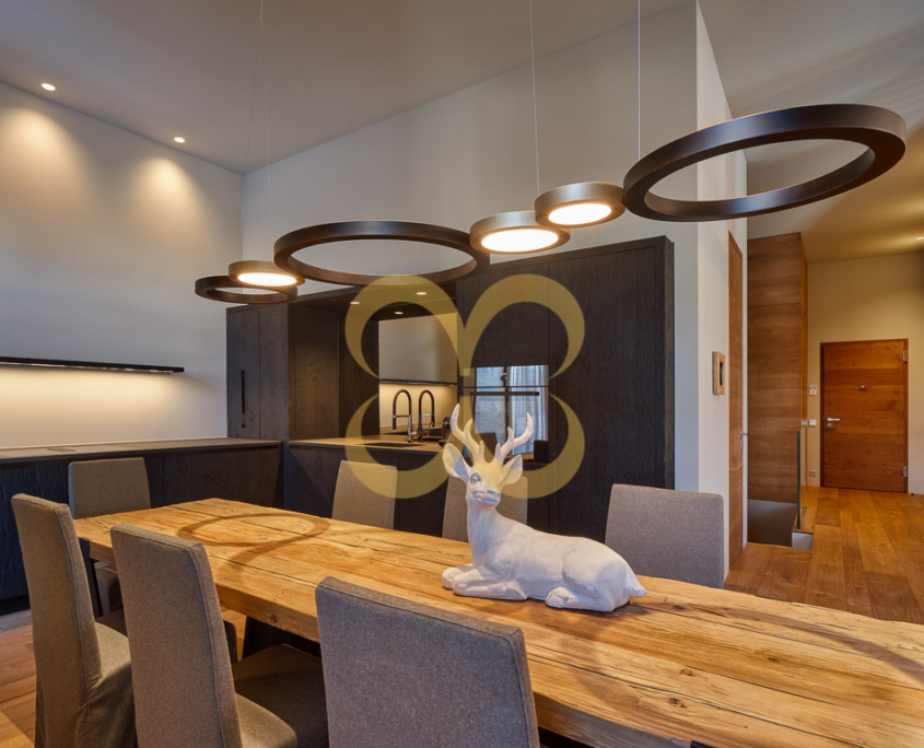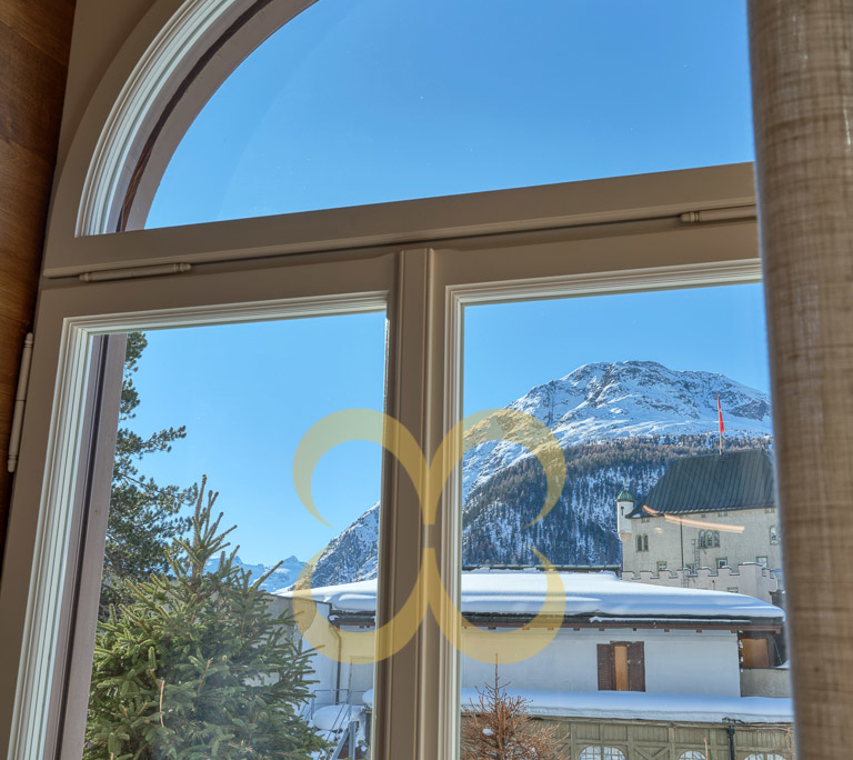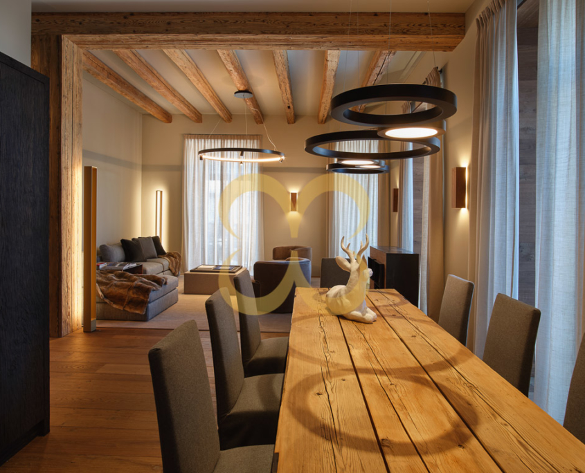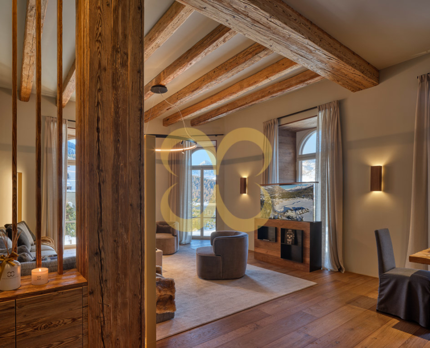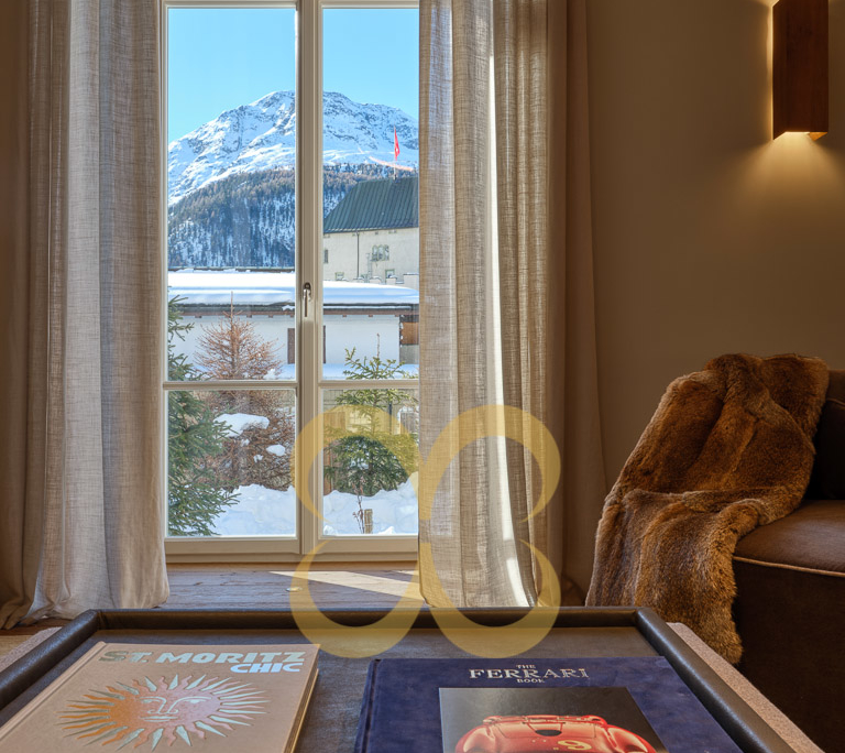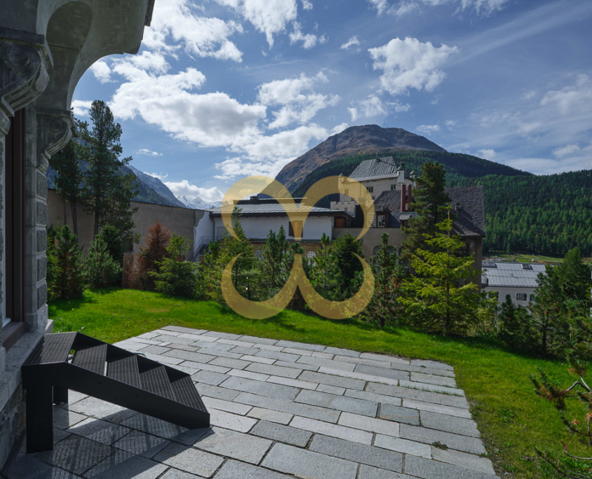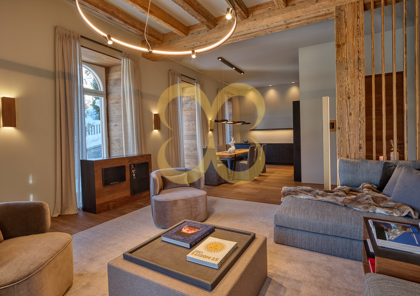 Wunderschöne, kürzlich renovierte Wohnung auf zwei Ebenen mit grossem Wohnzimmer mit direktem Ausgang in den Garten, von wo aus man eine atemberaubende Aussicht auf die Engadiner Berge geniessen kann.