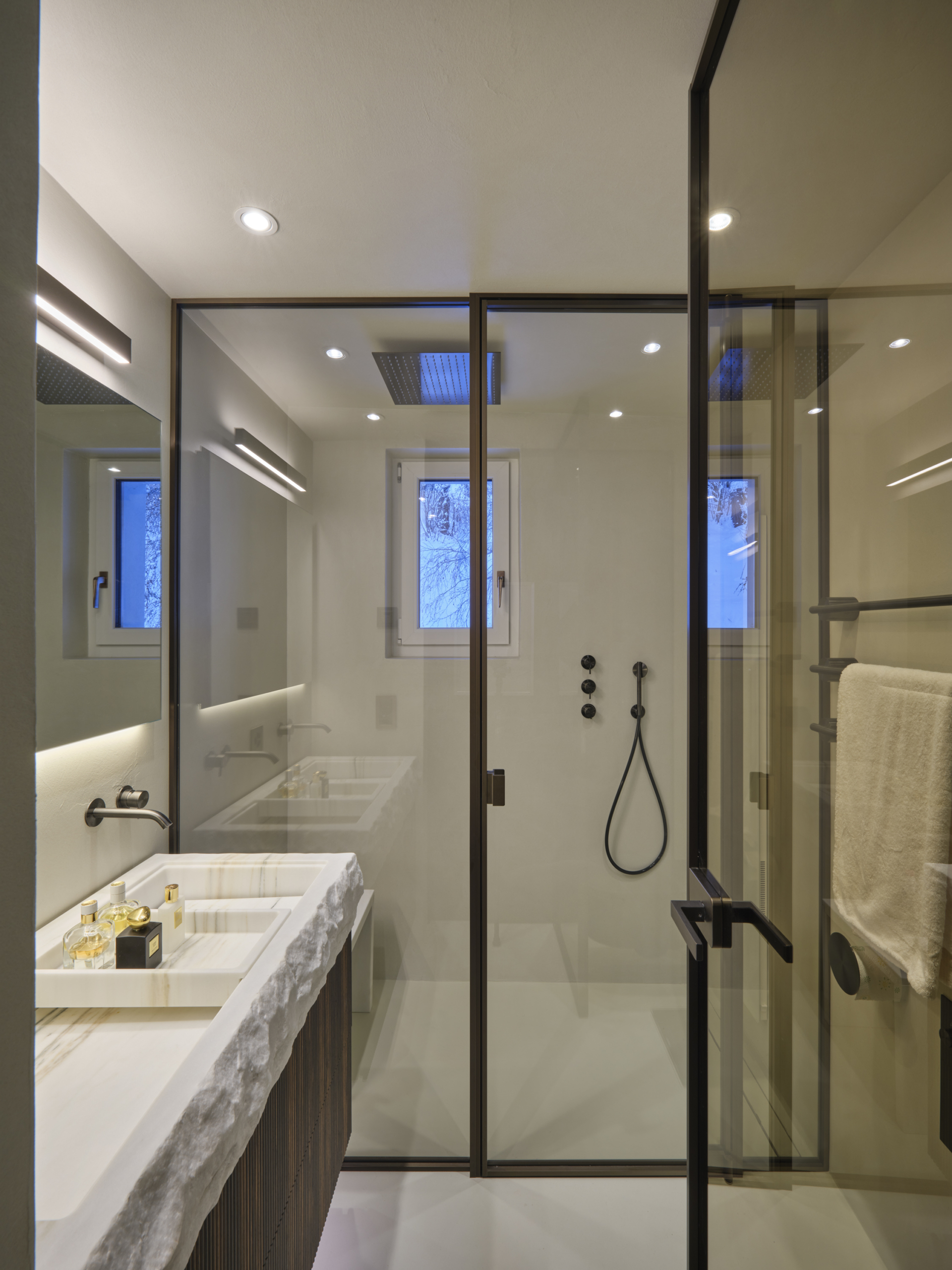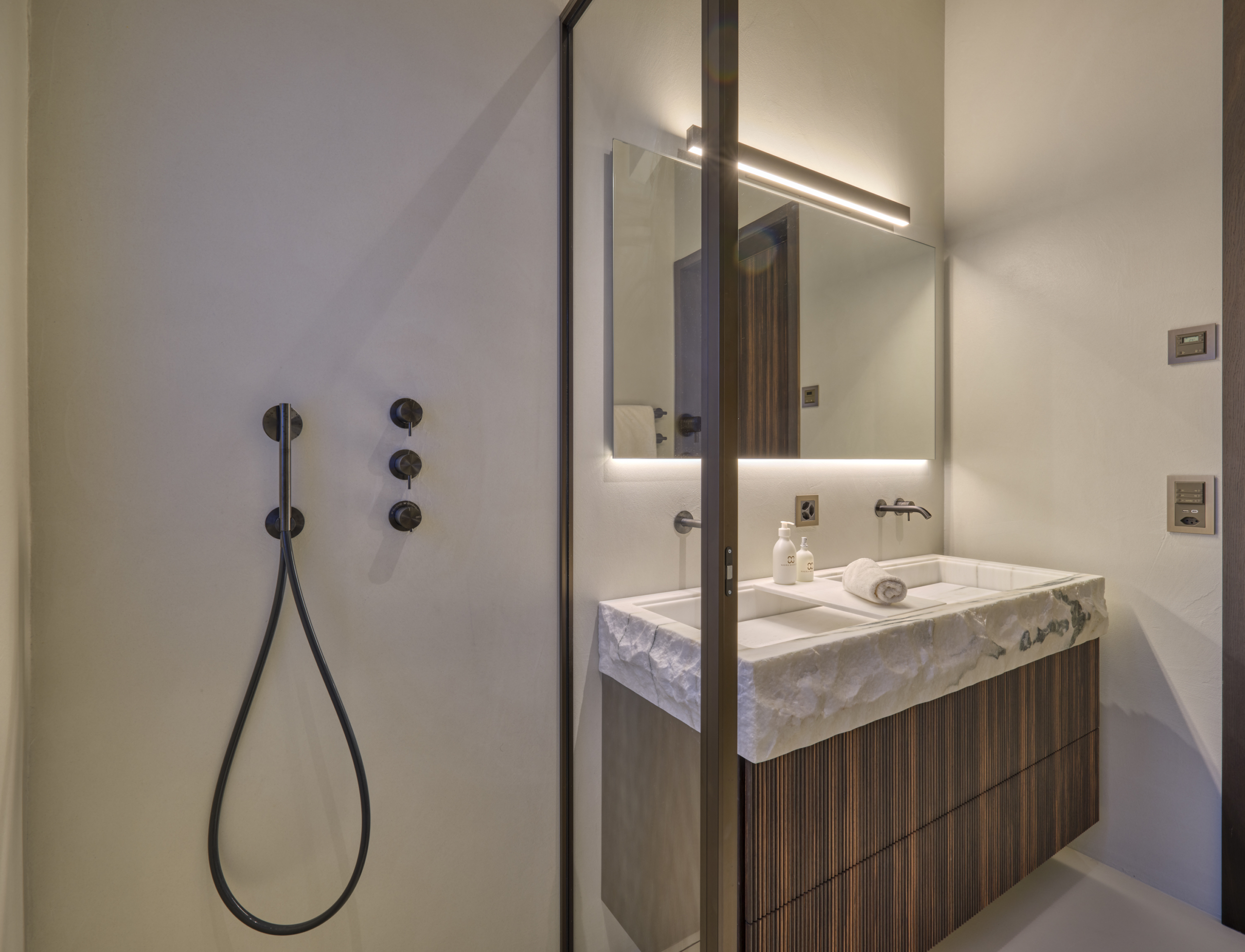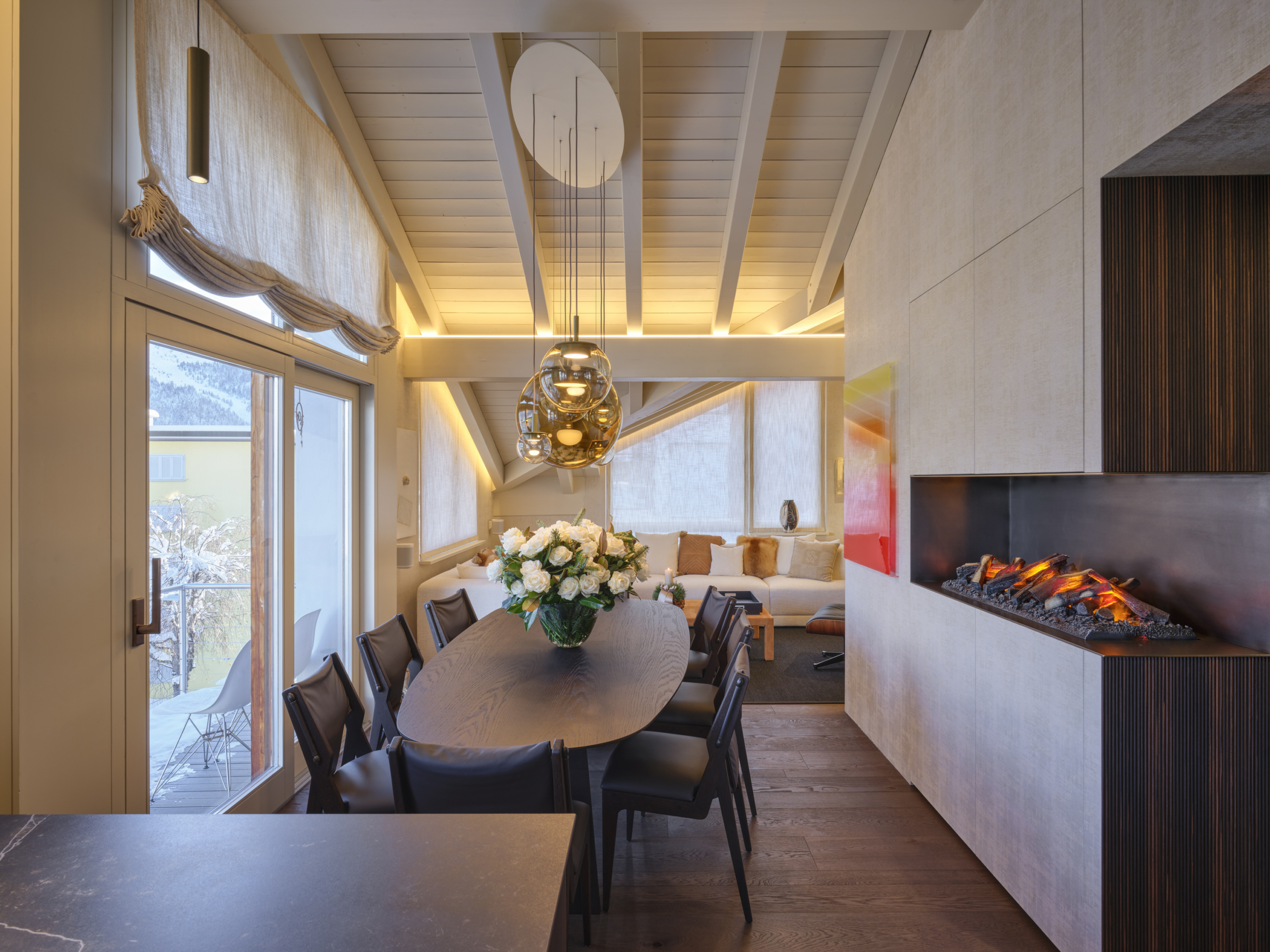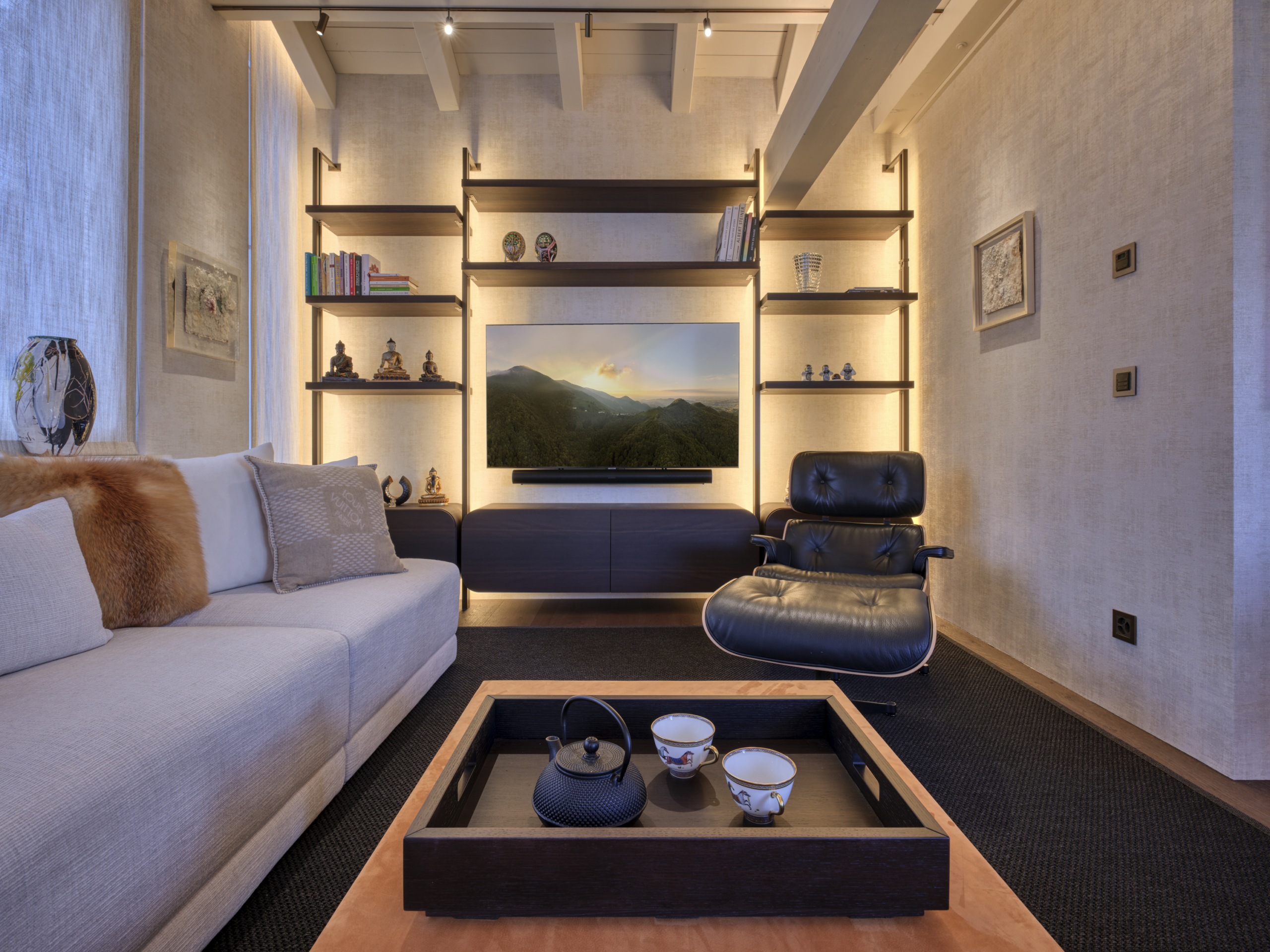 Ein Penthouse, in dem sich Eleganz und Materialität vereinen. Das Projekt basiert auf einer sorgfältigen Auswahl von Texturen und Farbtönen: dunkel gerillte Wandverkleidungen, Leinenoberflächen, gebranntes Holz, Naturstahl und maßgefertigte Details schaffen eine intime, raffinierte Atmosphäre. Das Licht spielt mit Stoffen und Metallen und verleiht den Räumen Tiefe und Harmonie. Von der Haute-Material-Küche bis zu den individuell gestalteten Schlafzimmern verkörpert jedes Element das Konzept des Maximum Wellbeing – ein sinnliches, authentisches Wohnerlebnis.