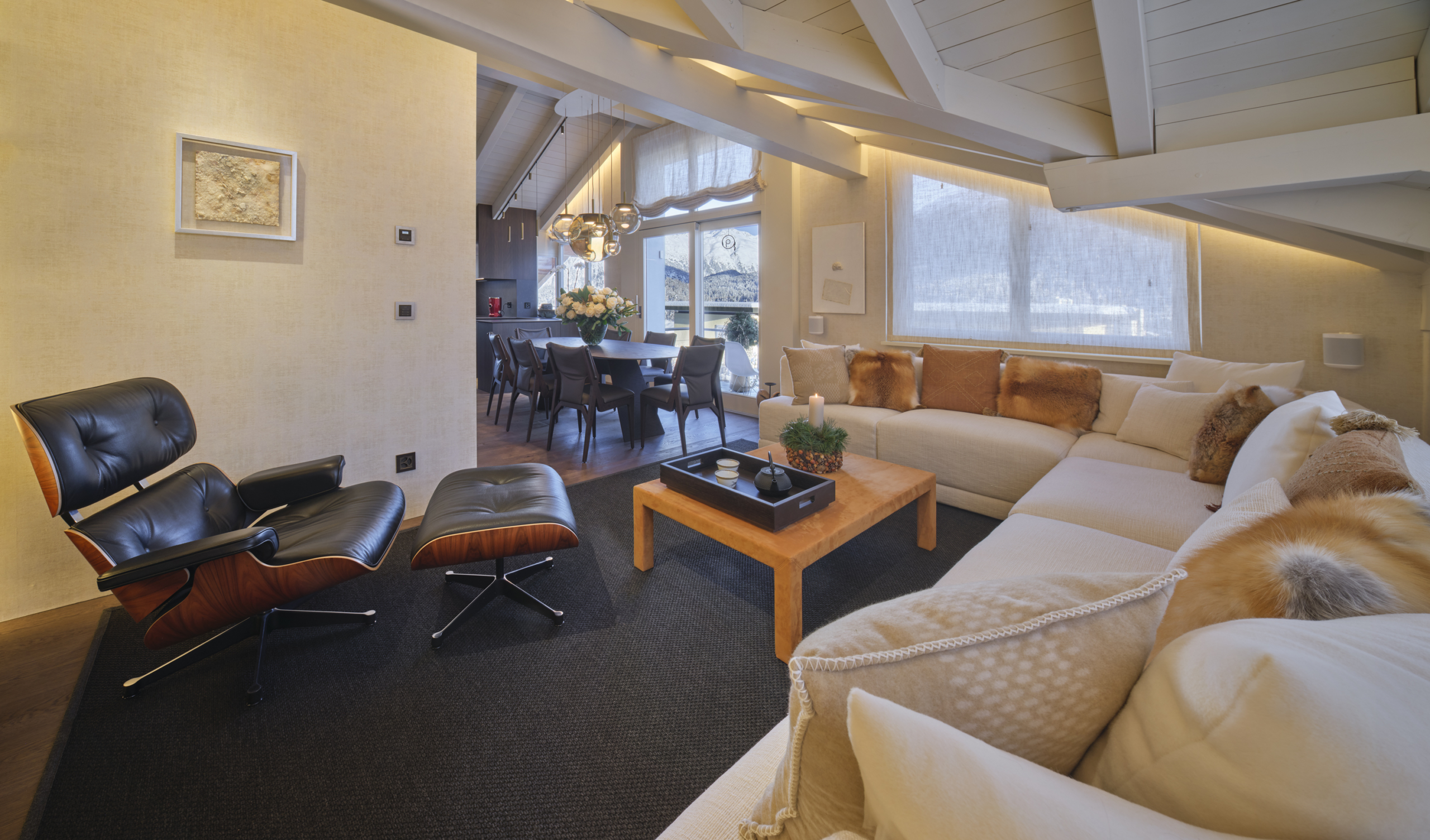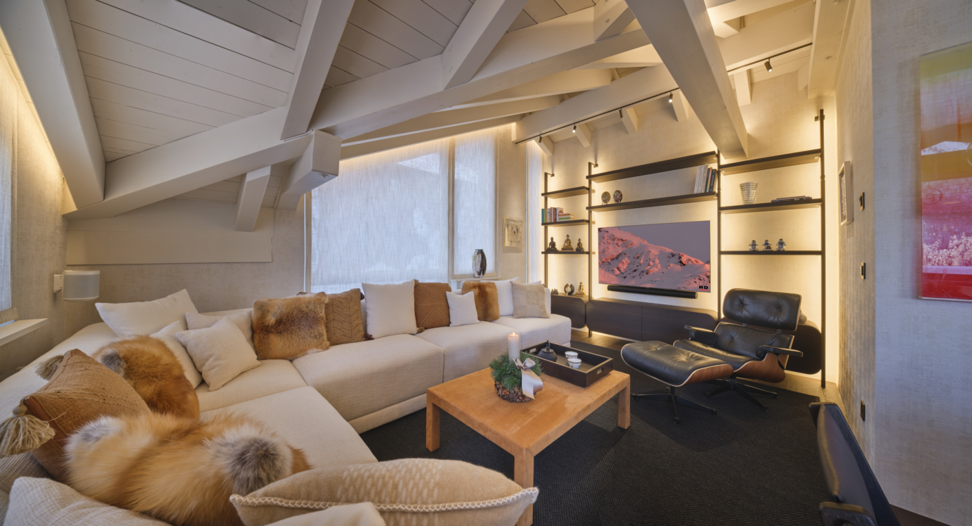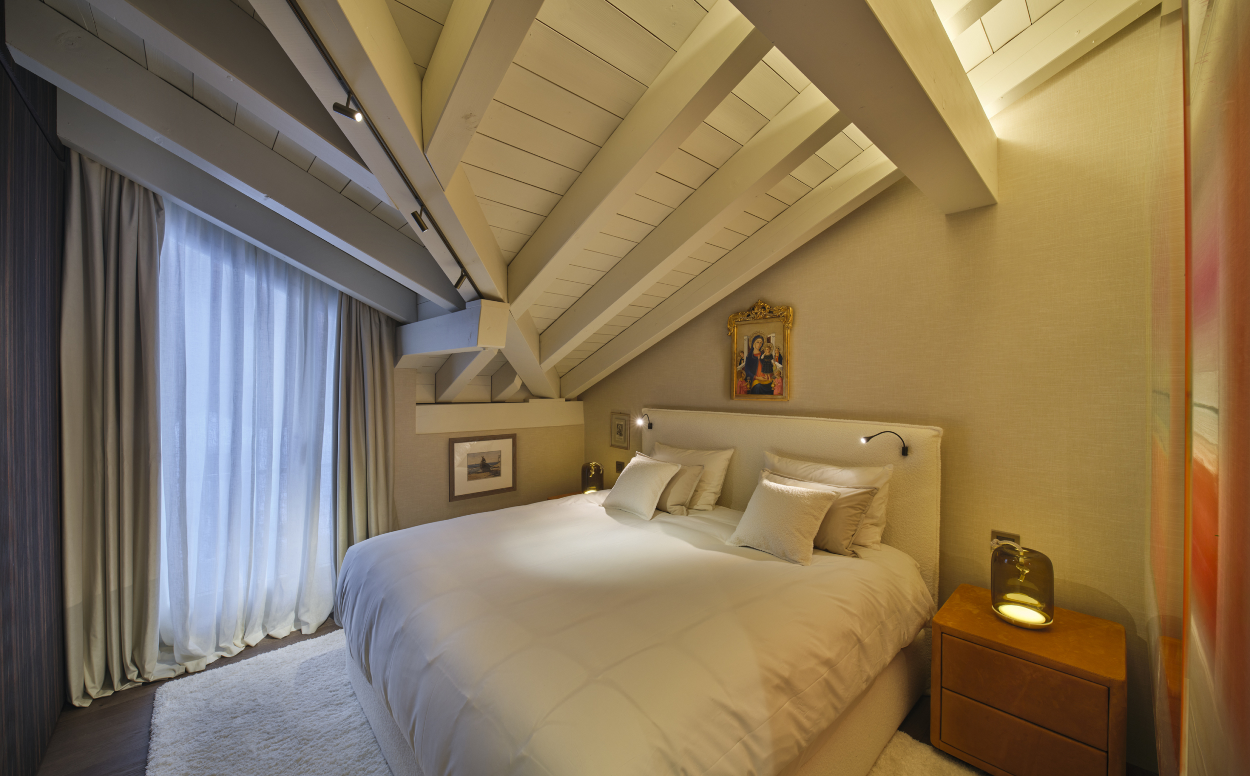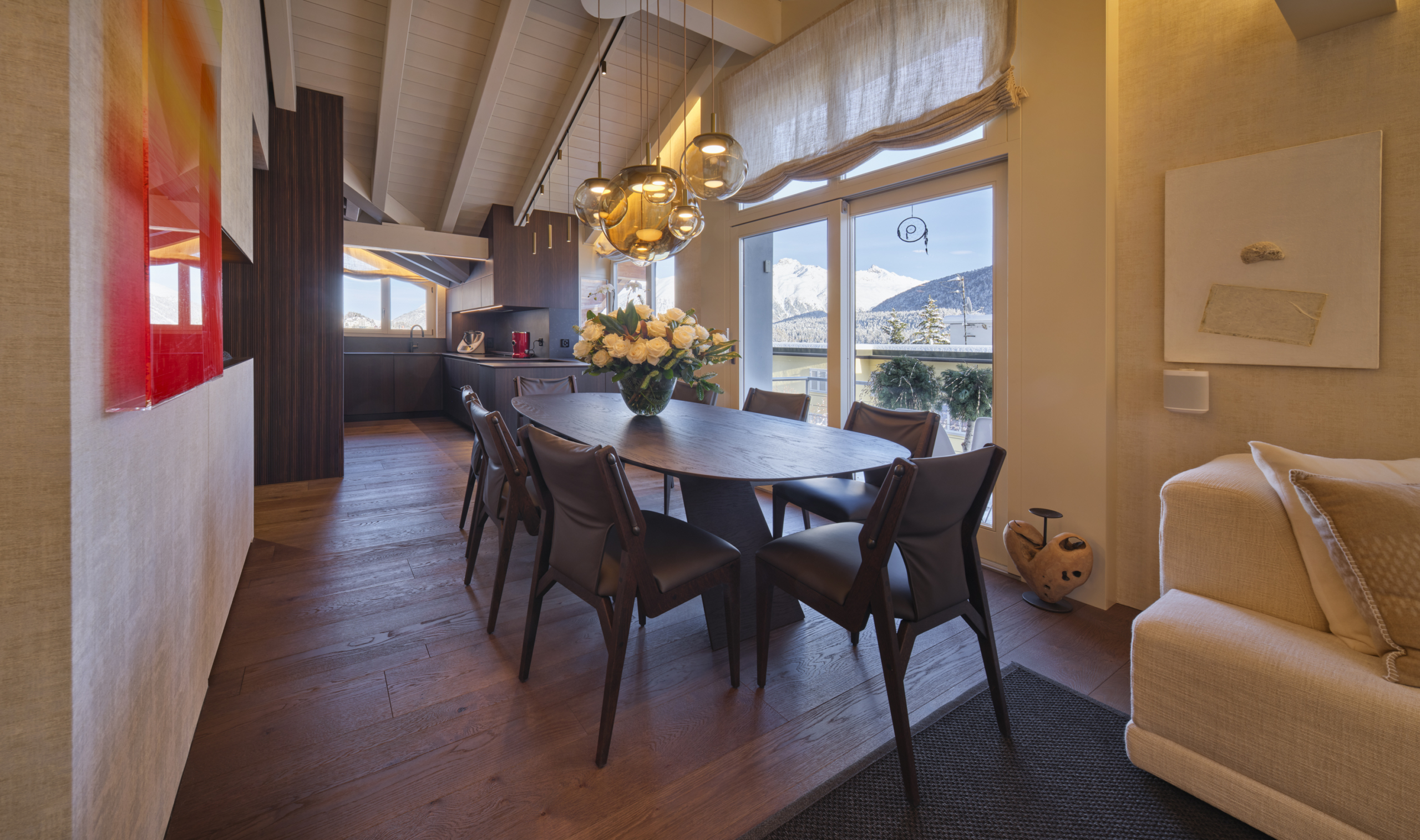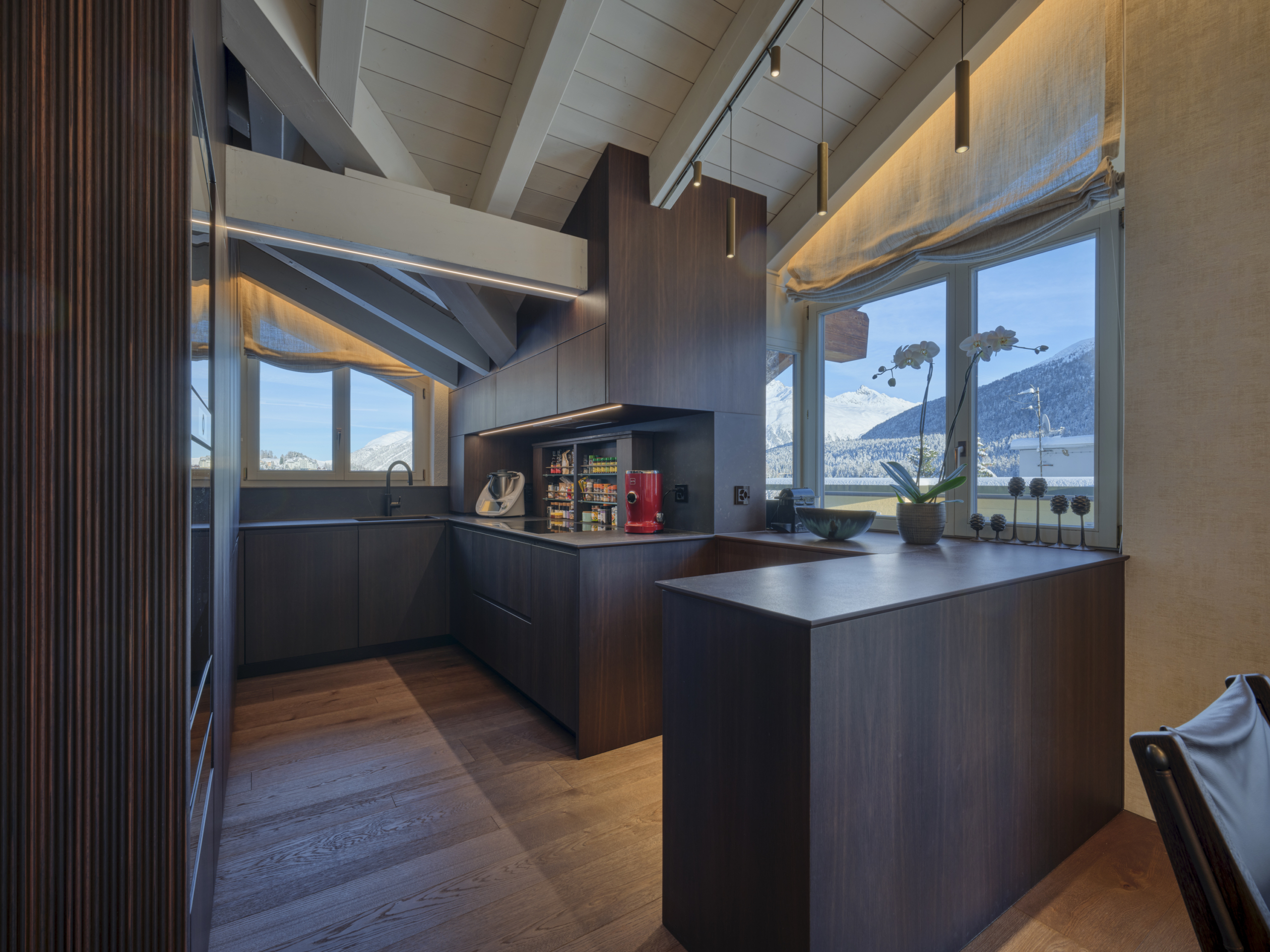Ein Penthouse, in dem sich Eleganz und Materialität vereinen. Das Projekt basiert auf einer sorgfältigen Auswahl von Texturen und Farbtönen: dunkel gerillte Wandverkleidungen, Leinenoberflächen, gebranntes Holz, Naturstahl und maßgefertigte Details schaffen eine intime, raffinierte Atmosphäre. Das Licht spielt mit Stoffen und Metallen und verleiht den Räumen Tiefe und Harmonie. Von der Haute-Material-Küche bis zu den individuell gestalteten Schlafzimmern verkörpert jedes Element das Konzept des Maximum Wellbeing – ein sinnliches, authentisches Wohnerlebnis.