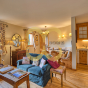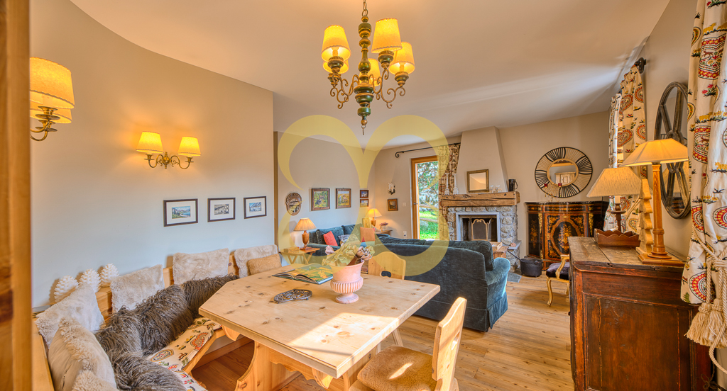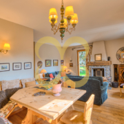 Wohnzimmer mit Kamin und Esszimmer mit Ausgang zum Garten