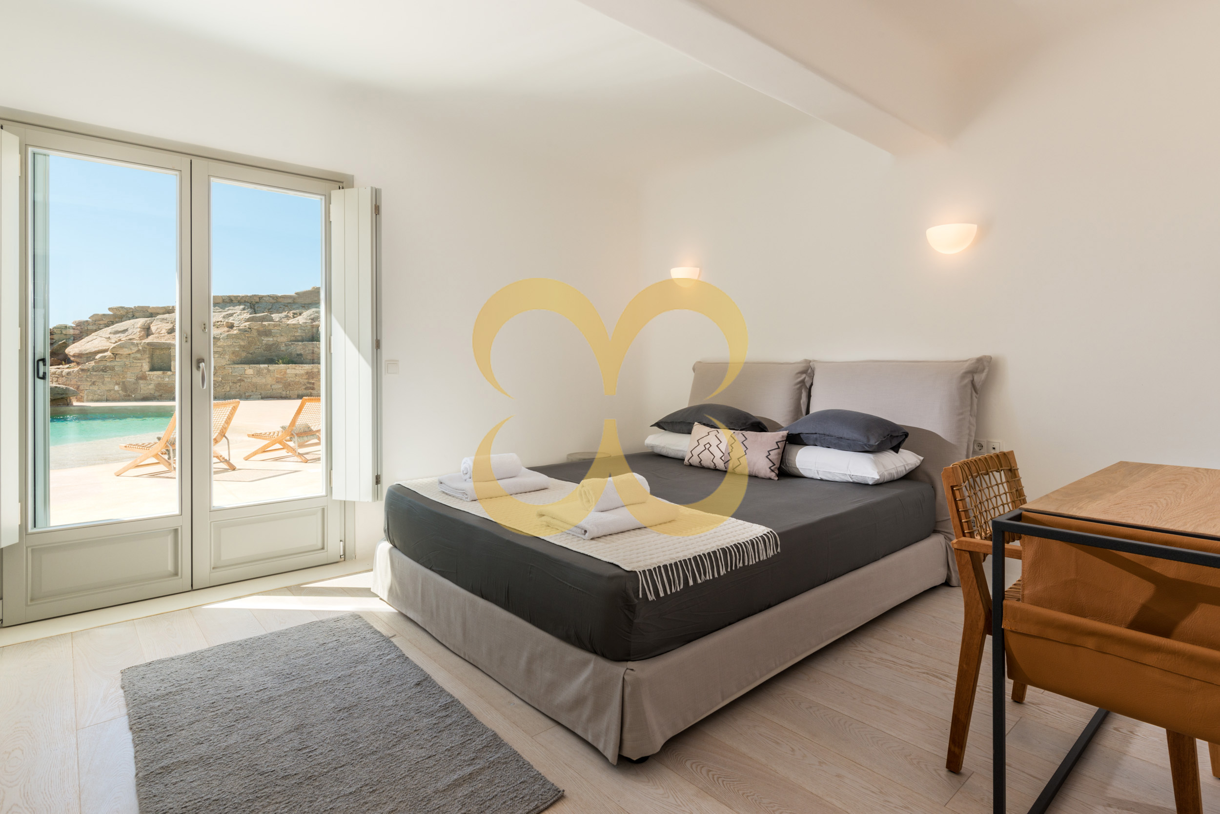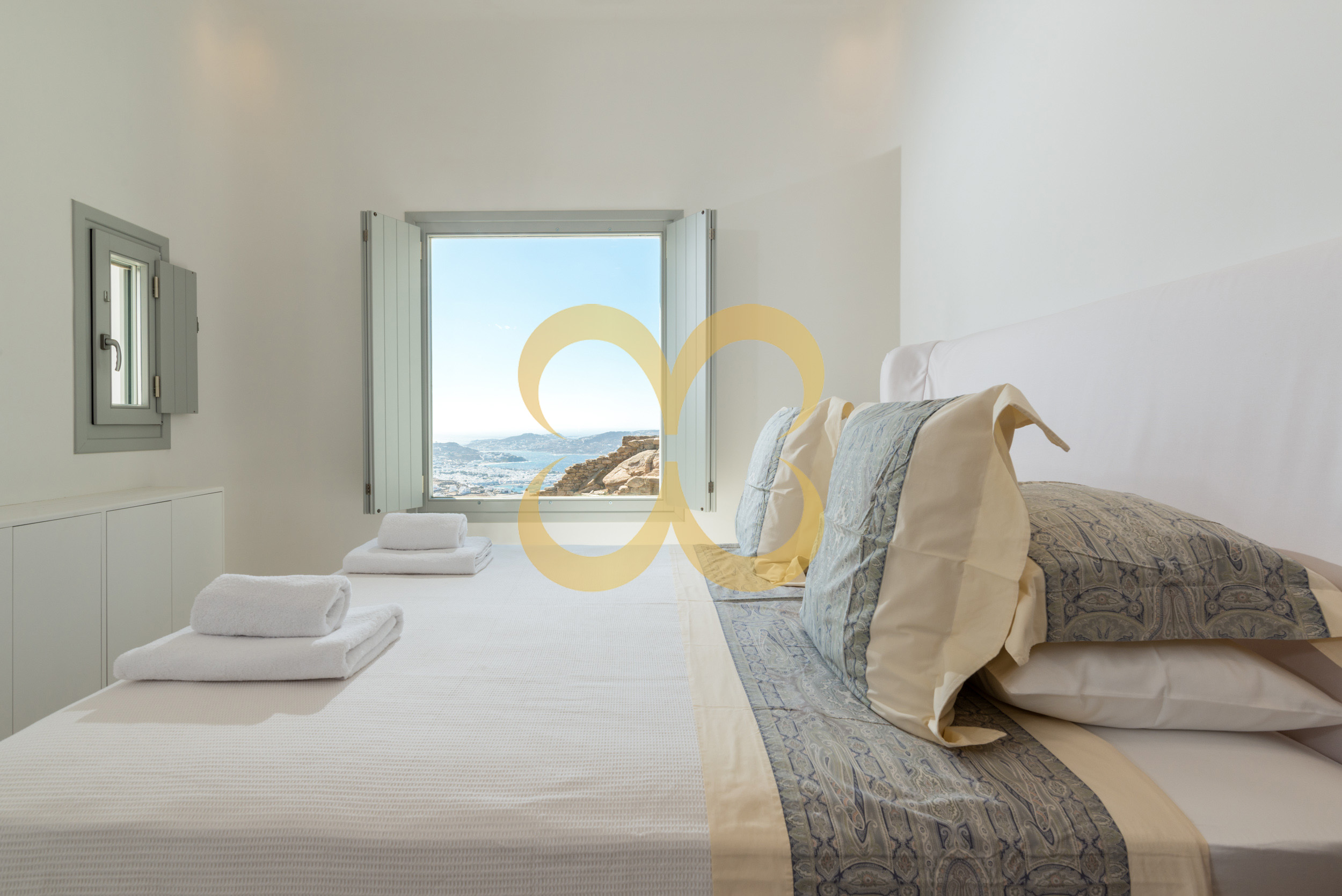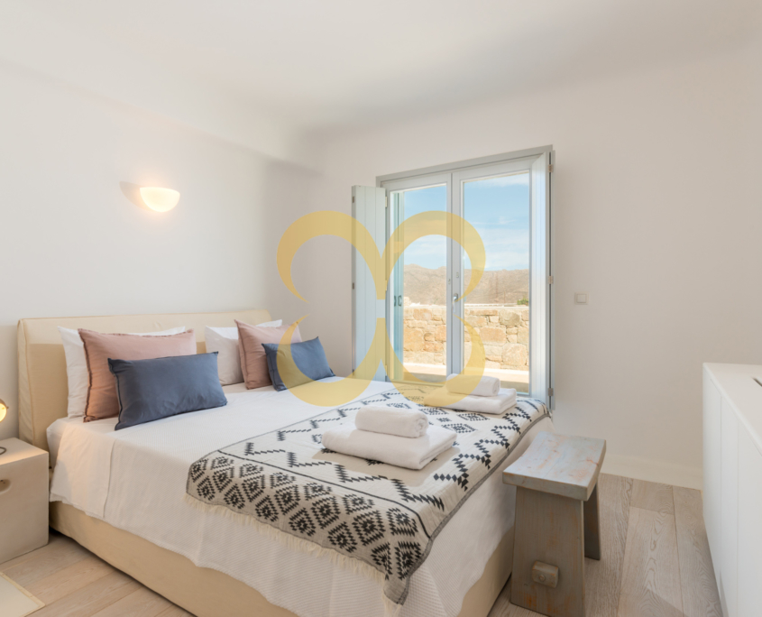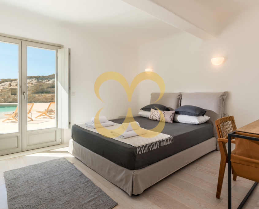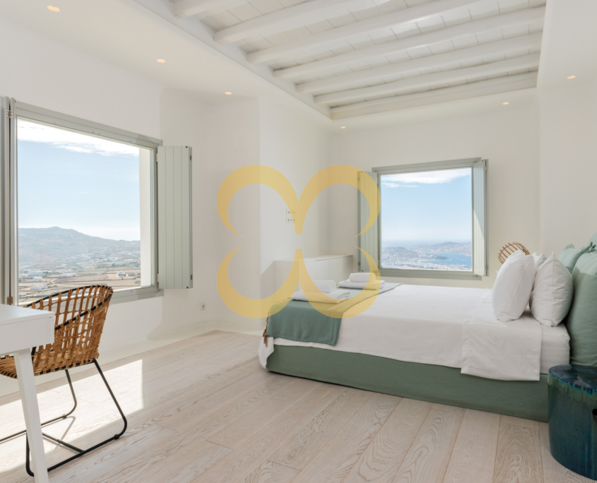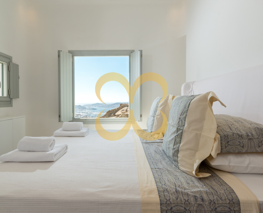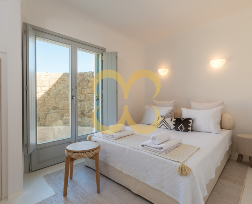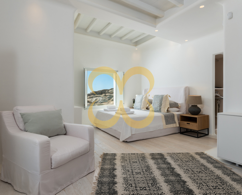 1 Hauptschlafzimmer mit Kingsize-Bett, en-suite Badezimmer, begehbarer Kleiderschrank, Zugang zum privaten Terrasse mit herrlichem Blick auf Mykonos-Stadt