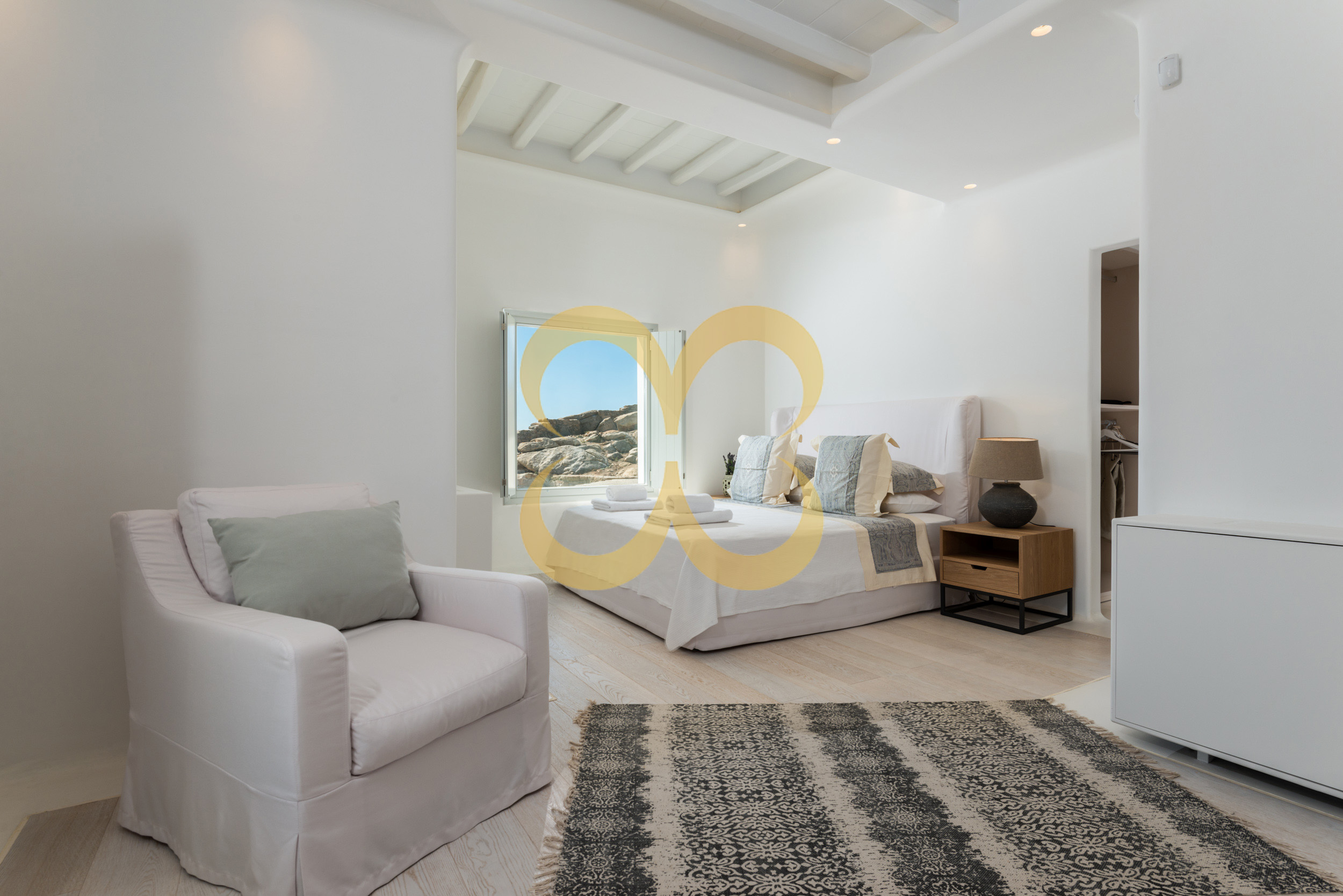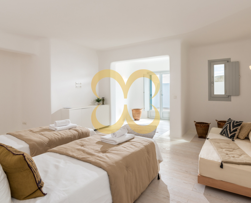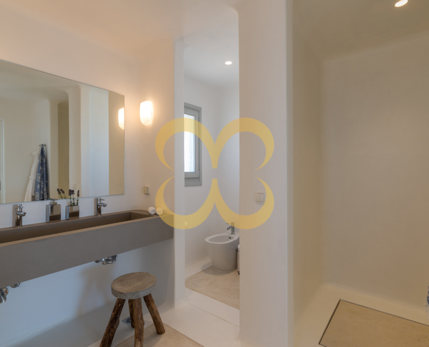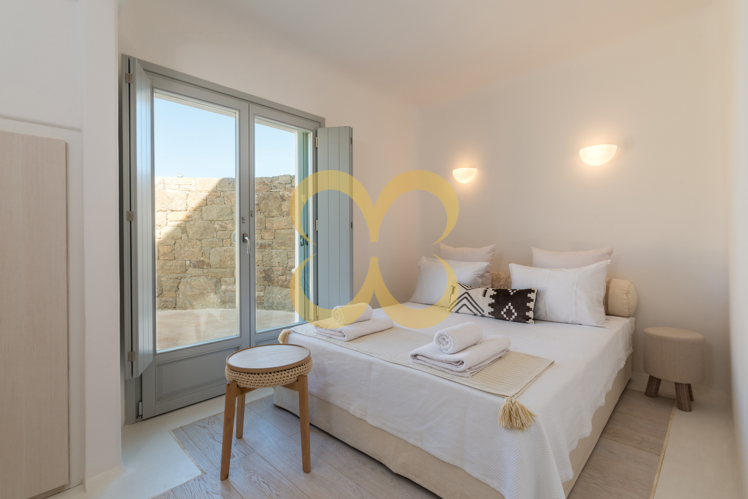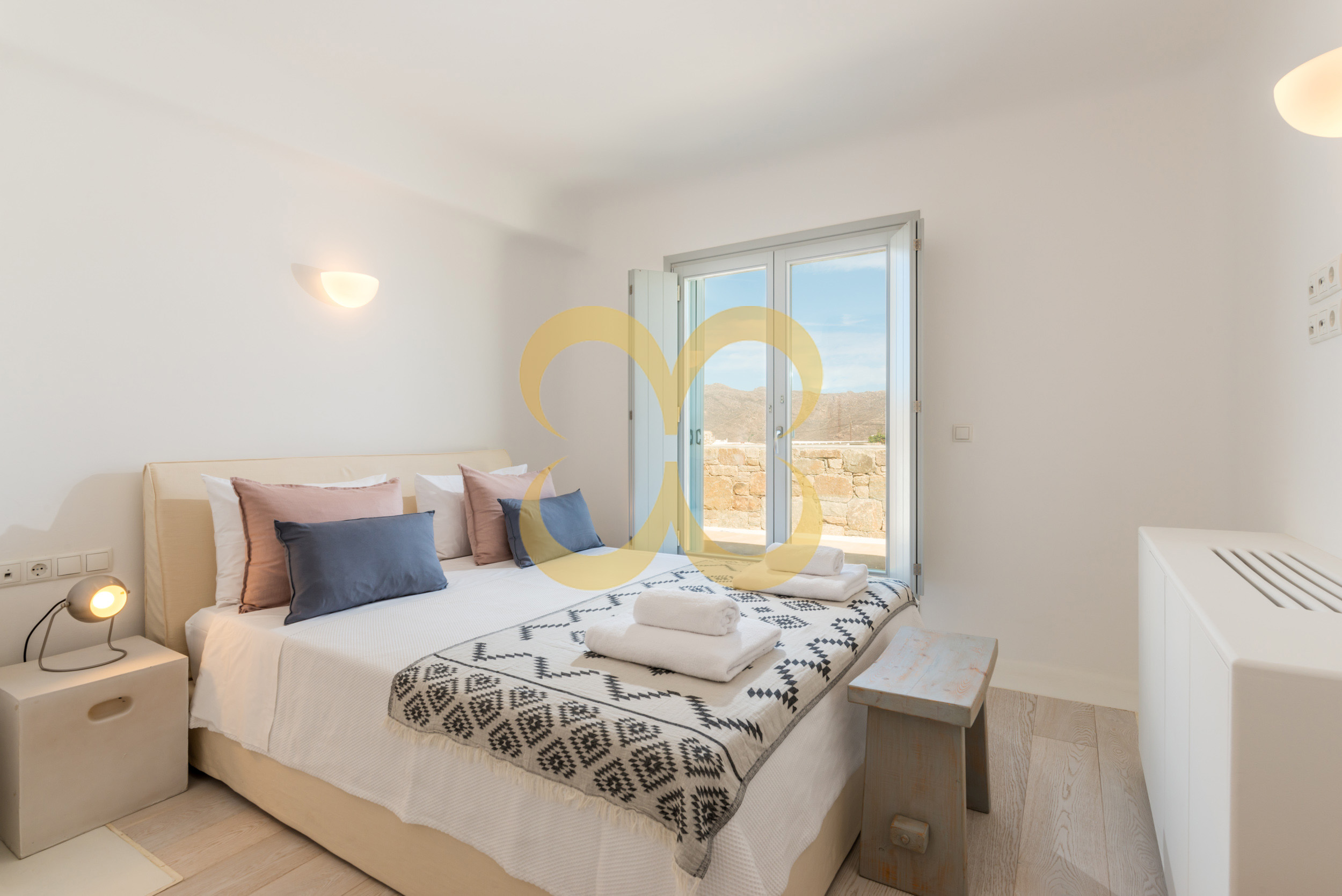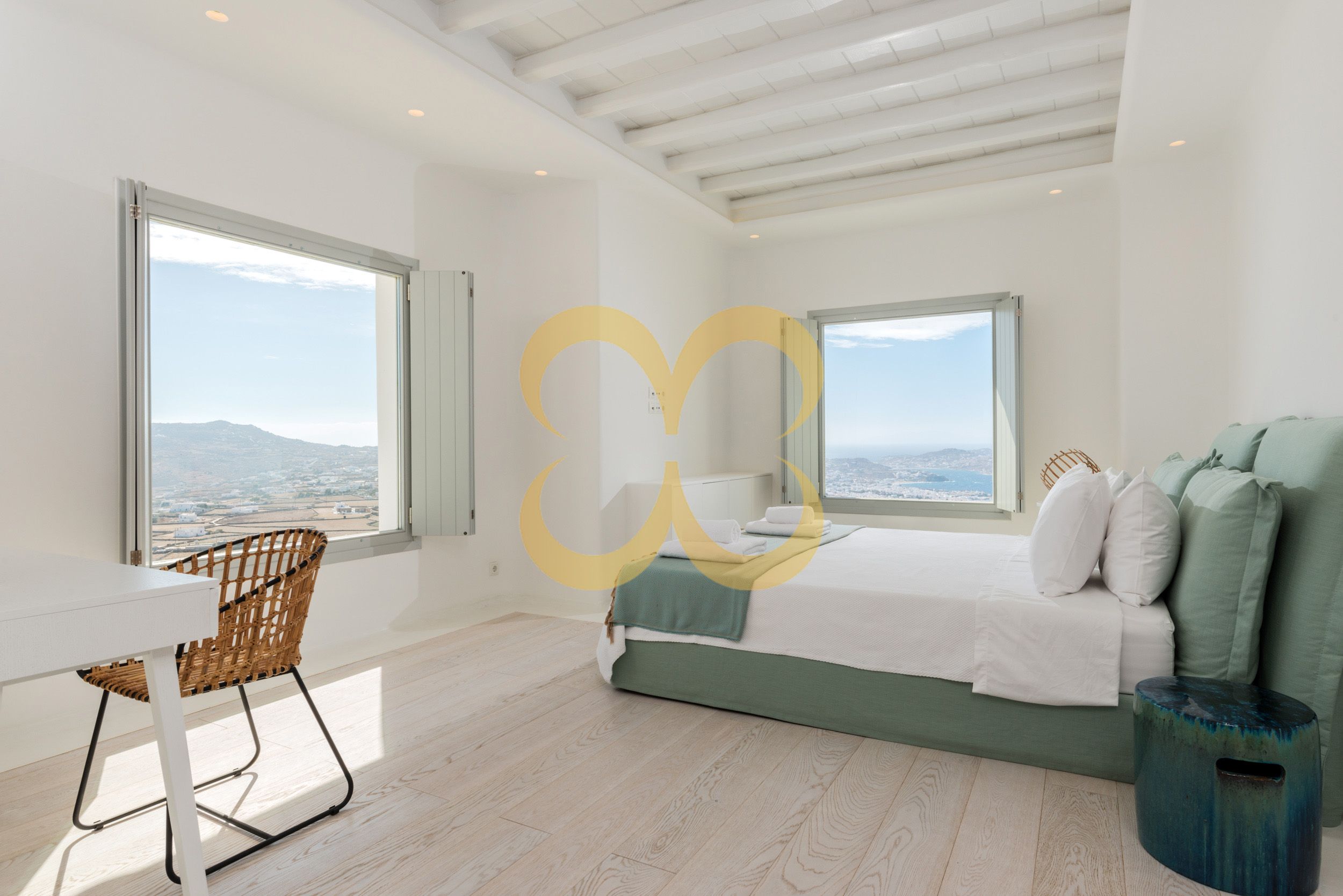 1 Hauptschlafzimmer mit Kingsize-Bett, en-suite Badezimmer, begehbarer Kleiderschrank, Zugang zum privaten Terrasse mit herrlichem Blick auf Mykonos-Stadt