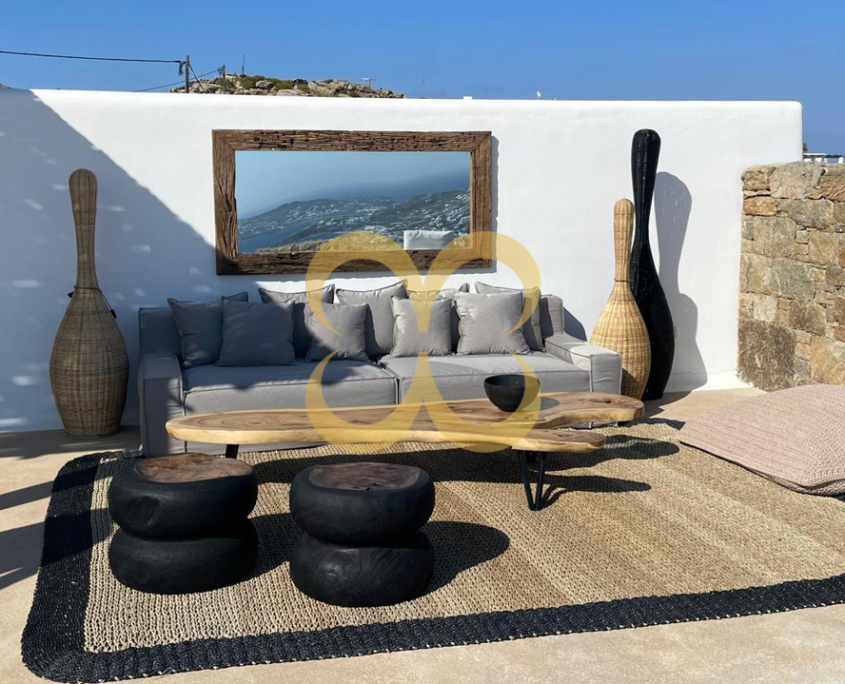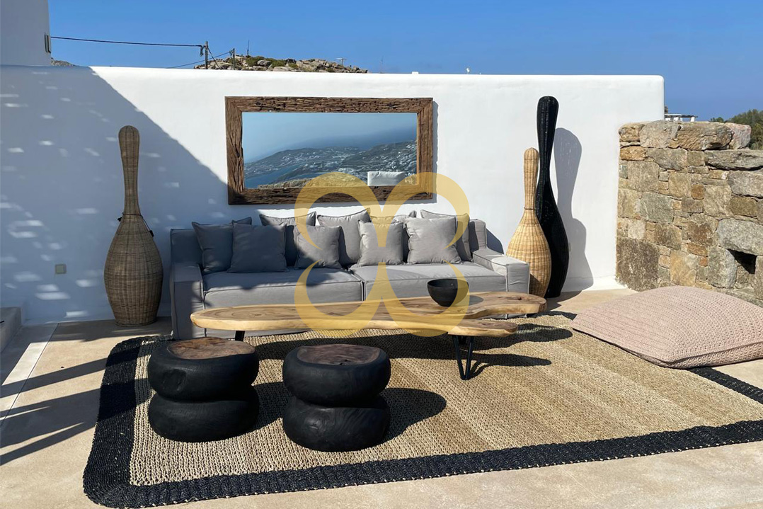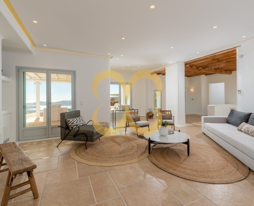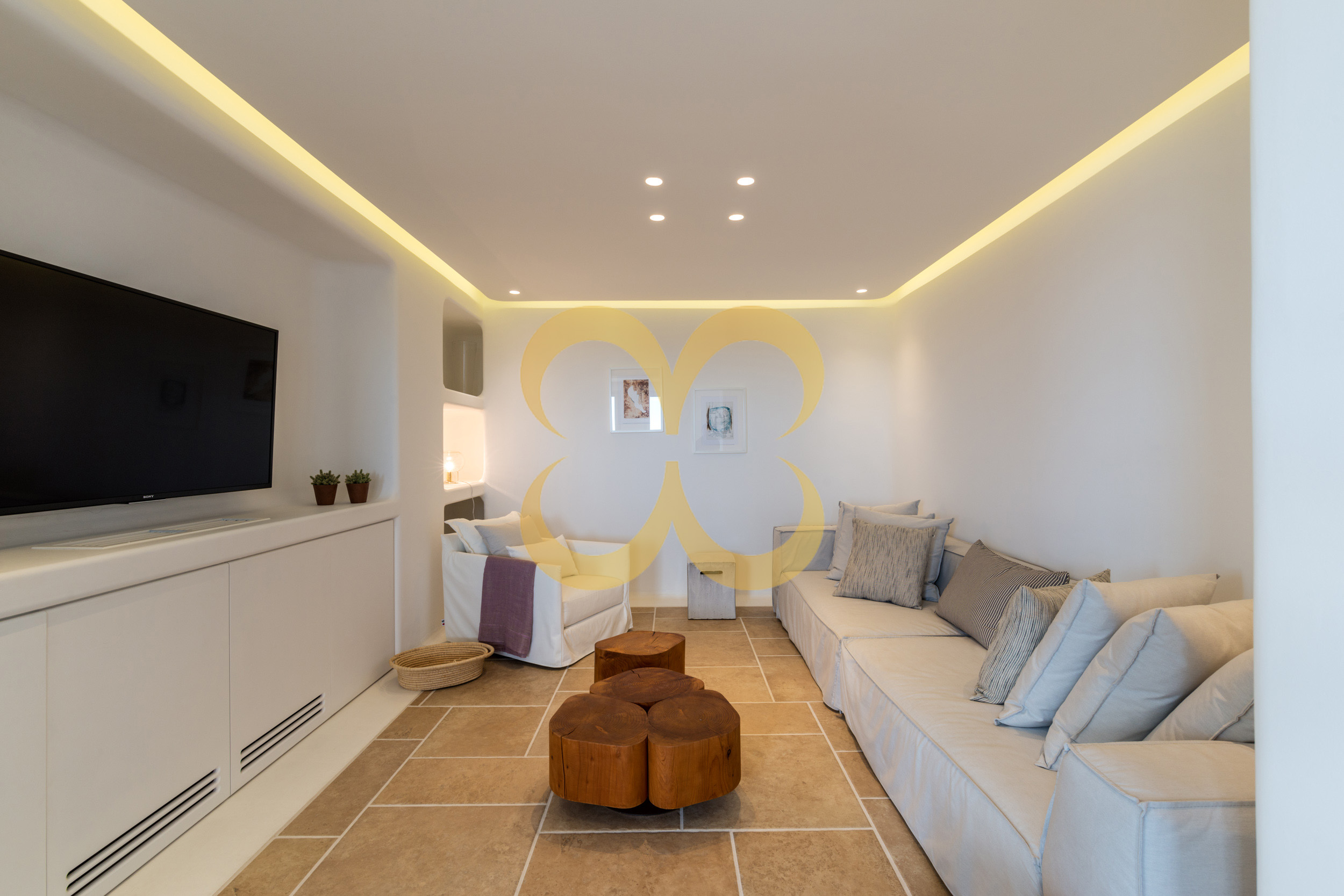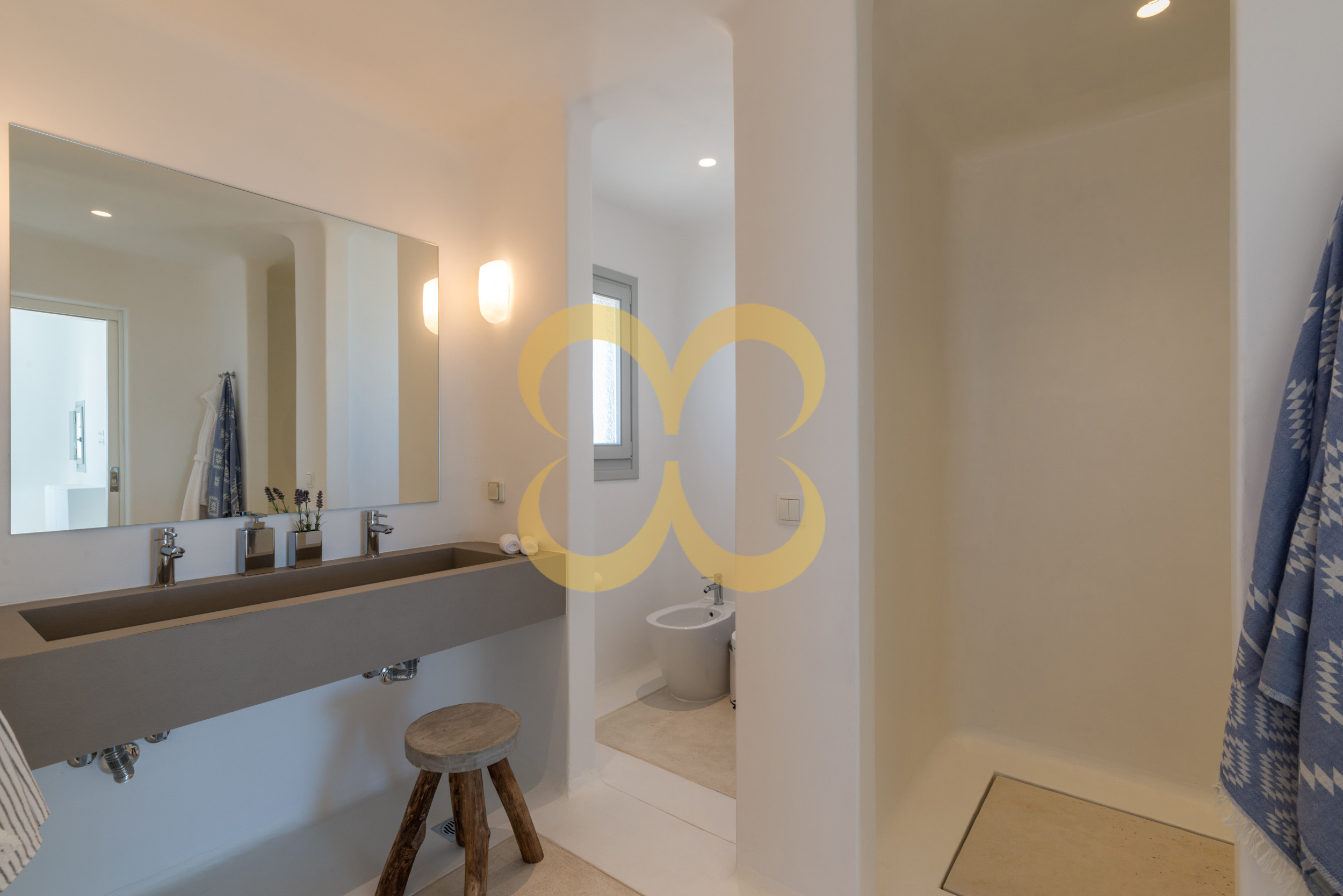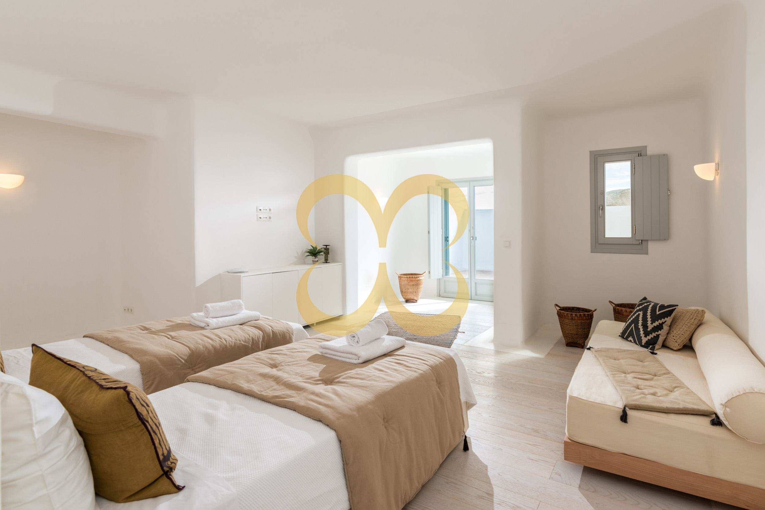 1 Hauptschlafzimmer mit Kingsize-Bett, en-suite Badezimmer, begehbarer Kleiderschrank, Zugang zum privaten Terrasse mit herrlichem Blick auf Mykonos-Stadt