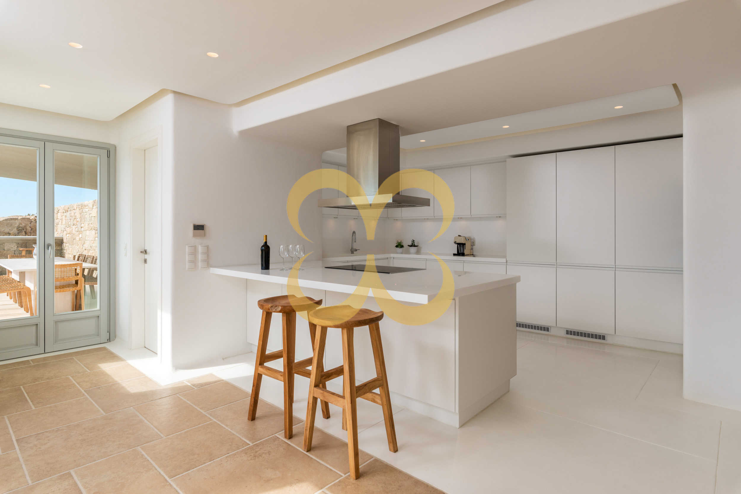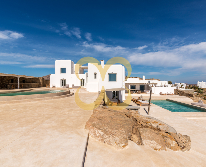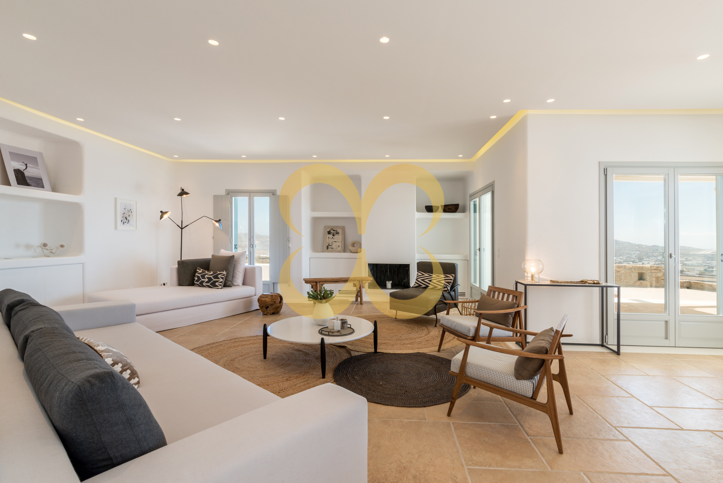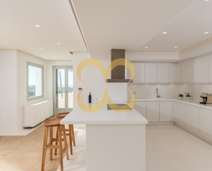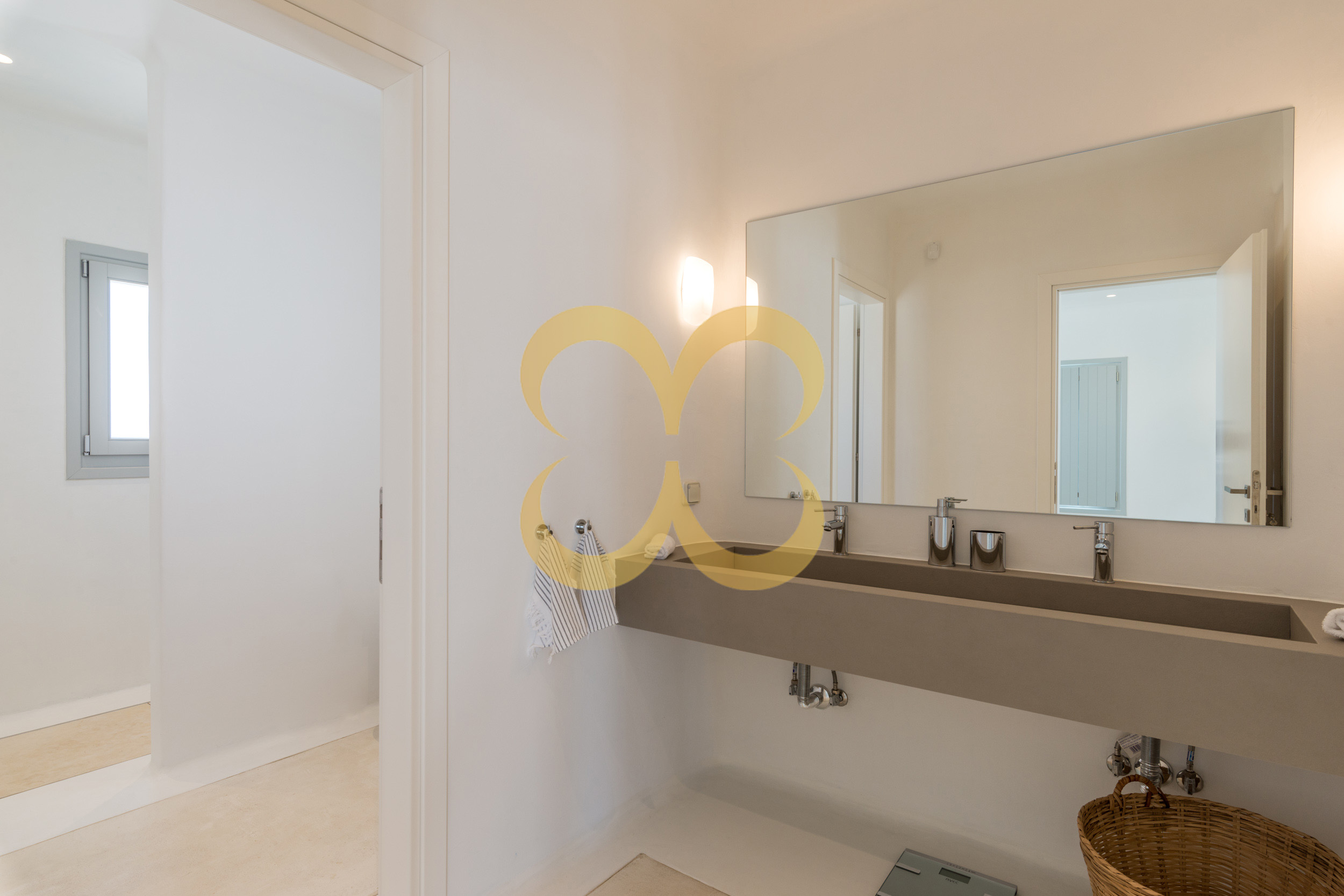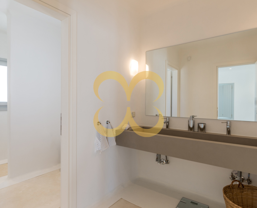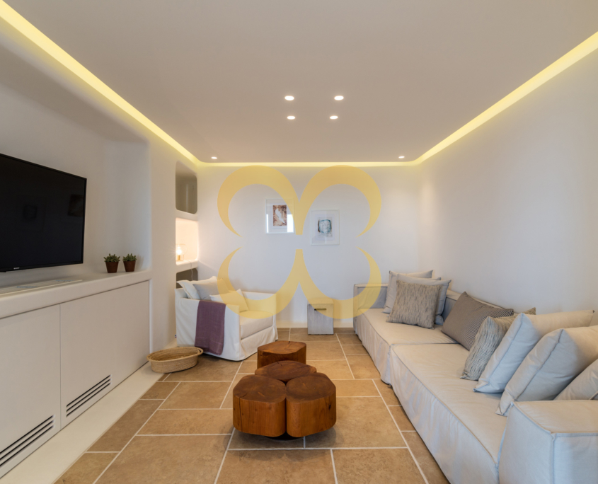 1 Hauptschlafzimmer mit Kingsize-Bett, en-suite Badezimmer, begehbarer Kleiderschrank, Zugang zum privaten Terrasse mit herrlichem Blick auf Mykonos-Stadt