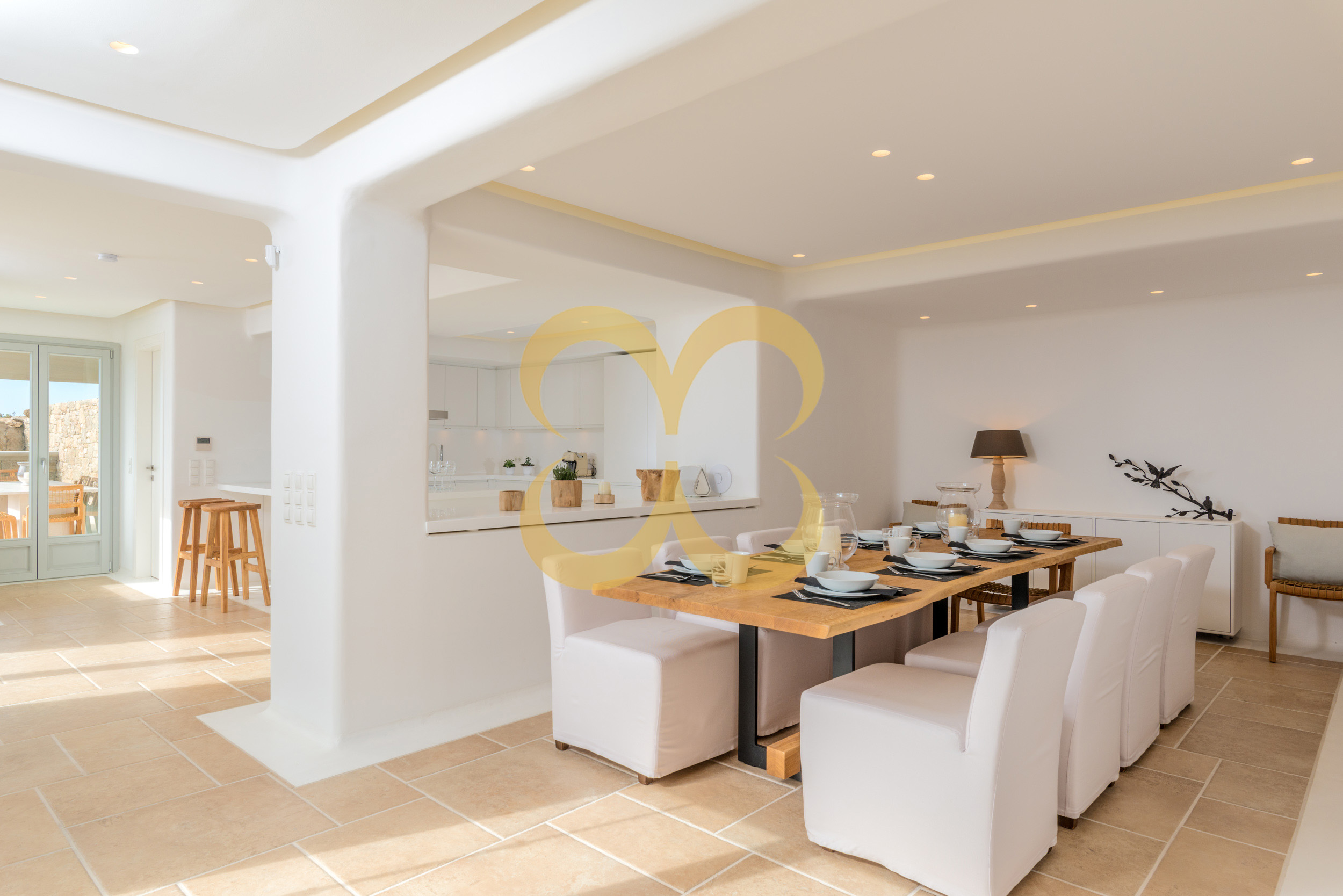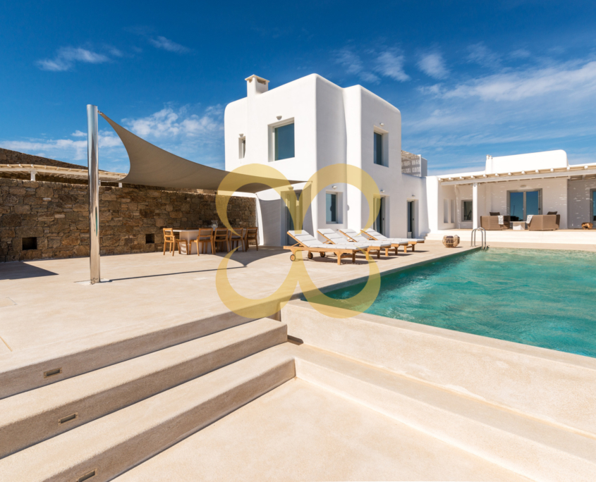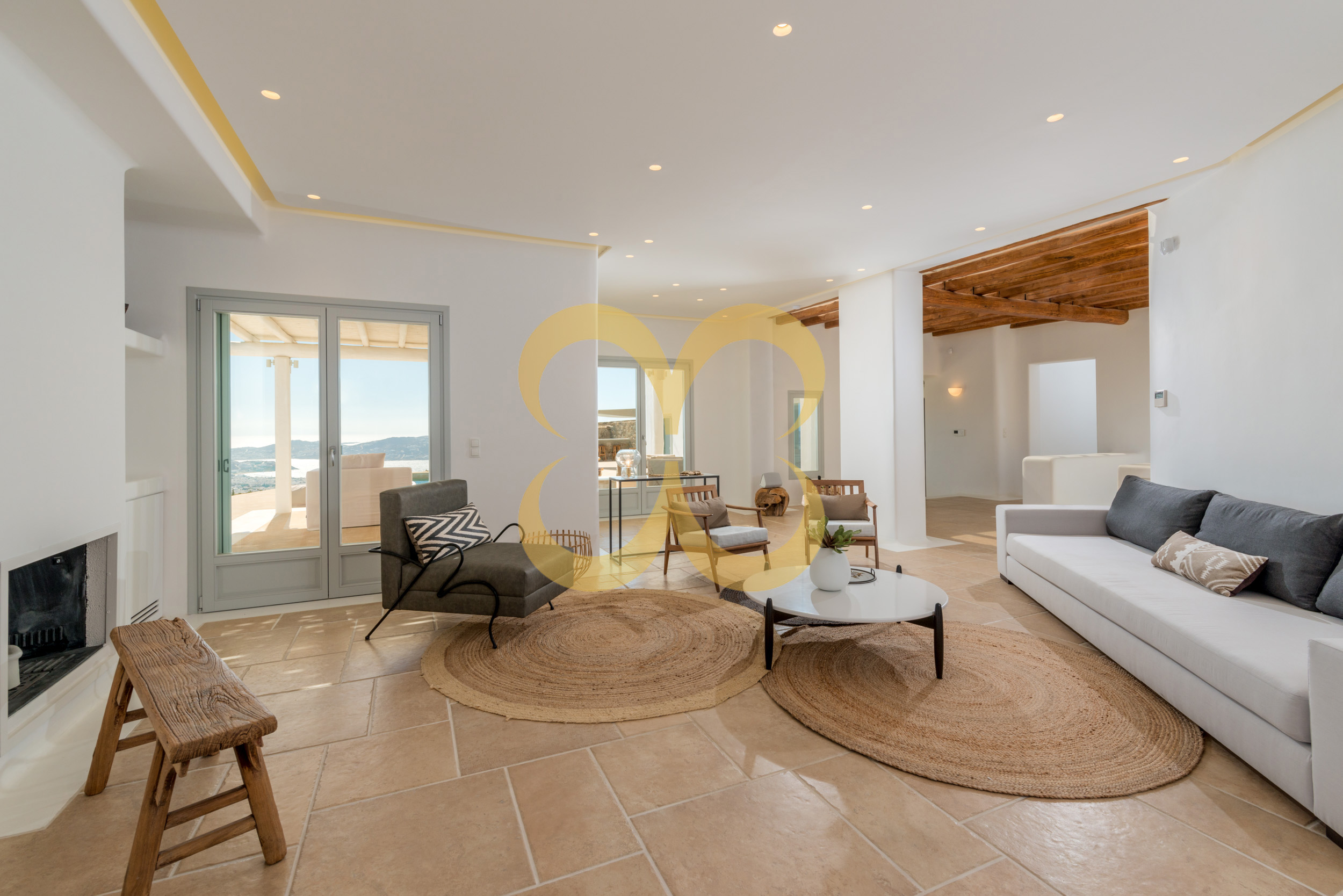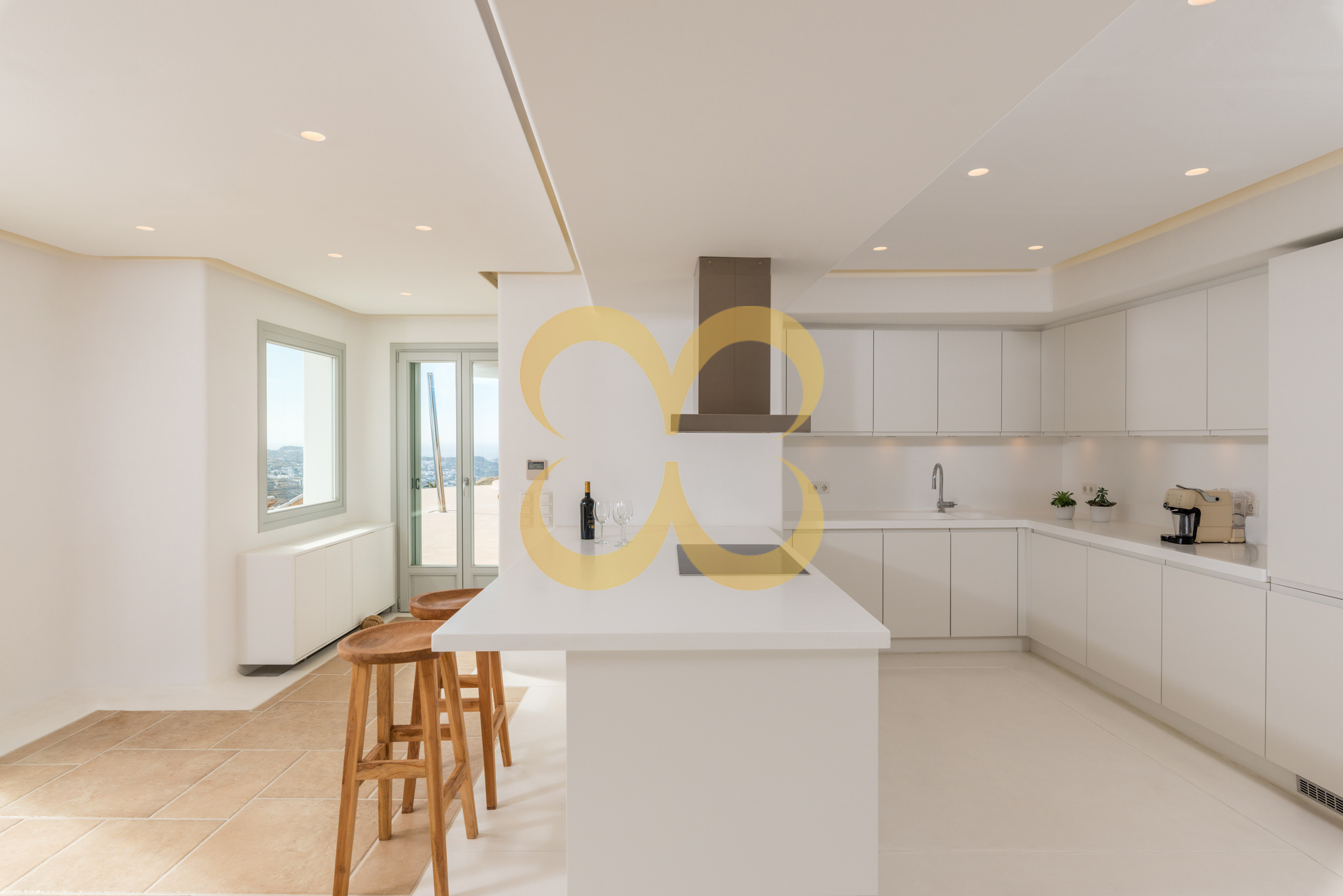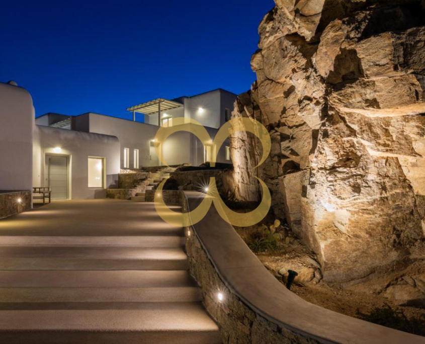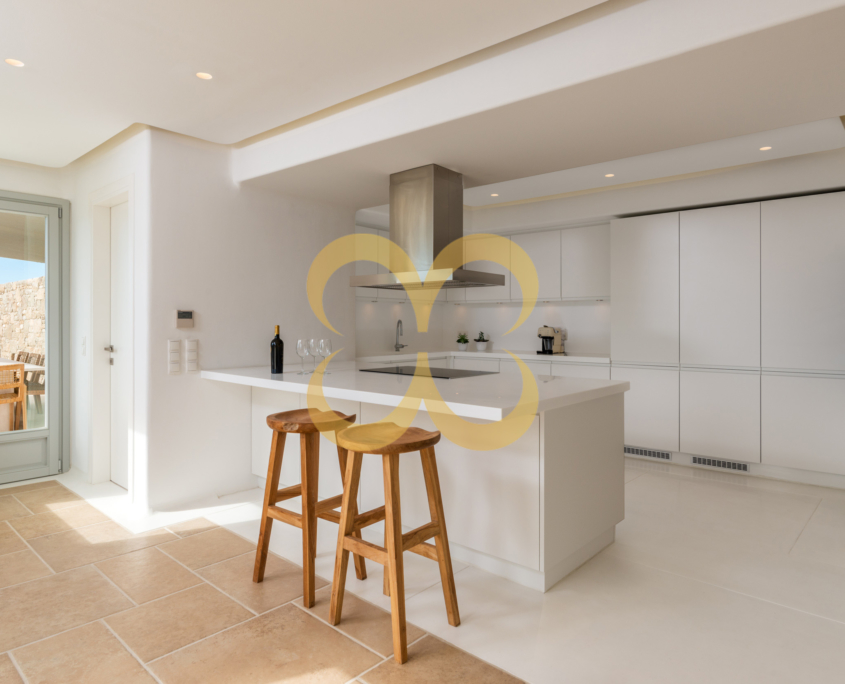1 Hauptschlafzimmer mit Kingsize-Bett, en-suite Badezimmer, begehbarer Kleiderschrank, Zugang zum privaten Terrasse mit herrlichem Blick auf Mykonos-Stadt