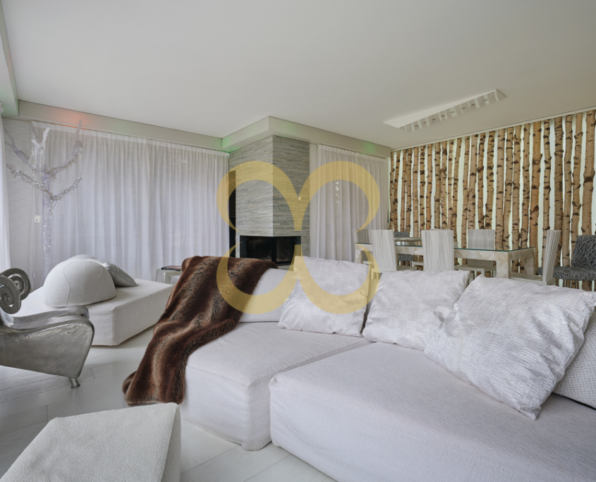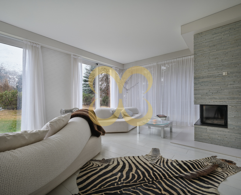 Geräumiges Wohnzimmer mit Kamin, offenes Esszimmer und Ausgang zum großen Garten mit Seeblick
